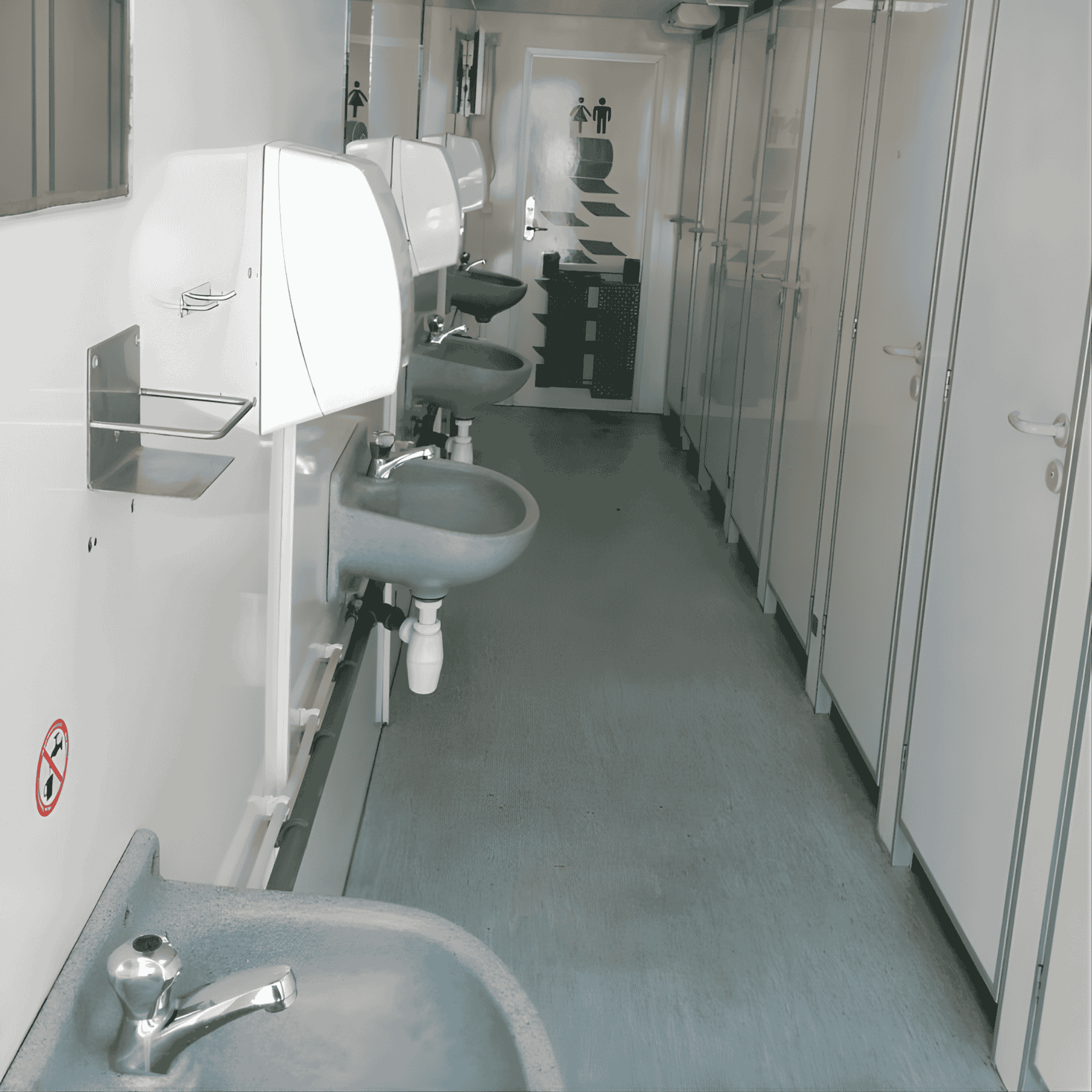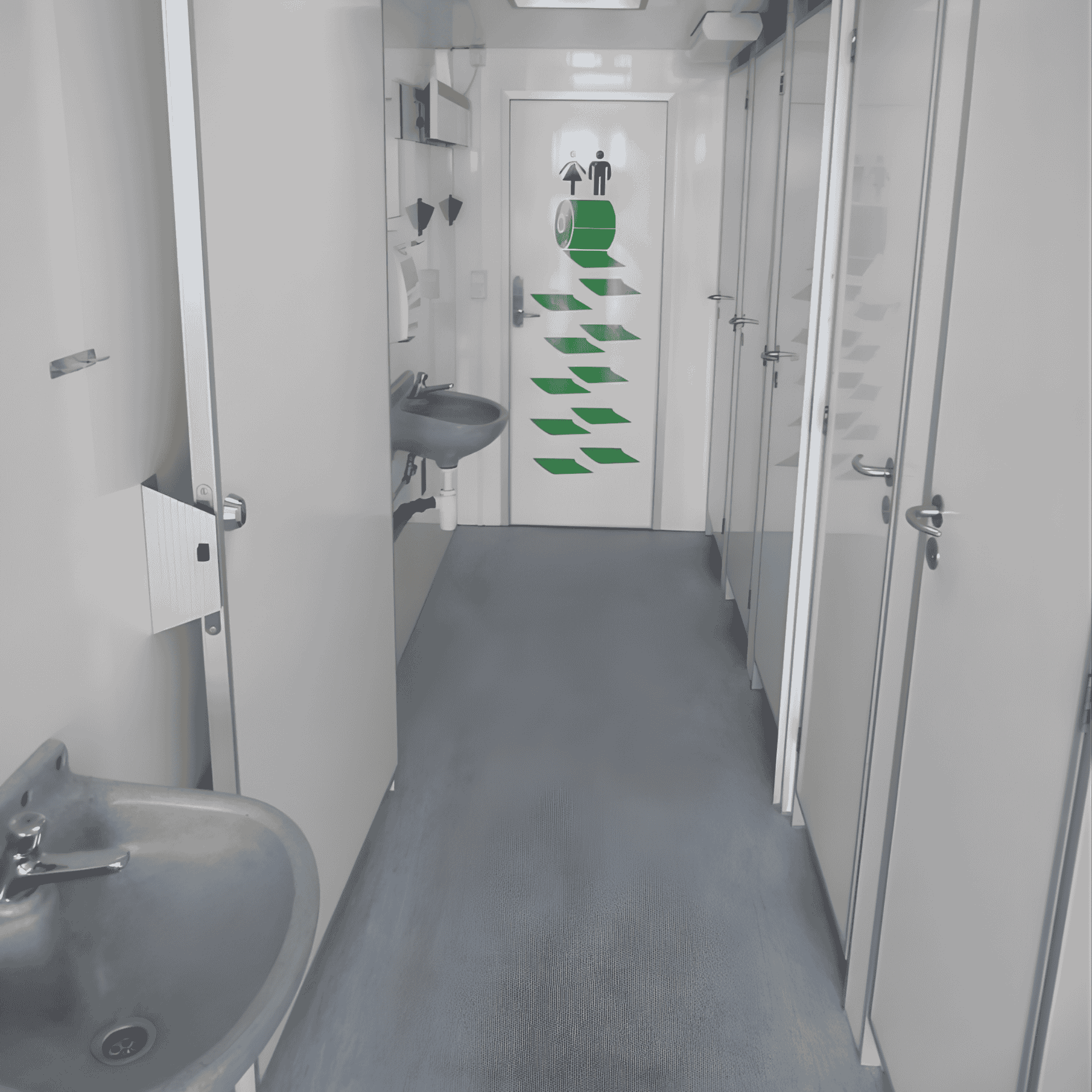 Toalettvogn med 10 separate toaletter – høy komfort og moderne design. Perfekt for arrangementer der gjesteopplevelsen er i fokus. Møblering inkluderer vasker og håndtørkere samt speil.