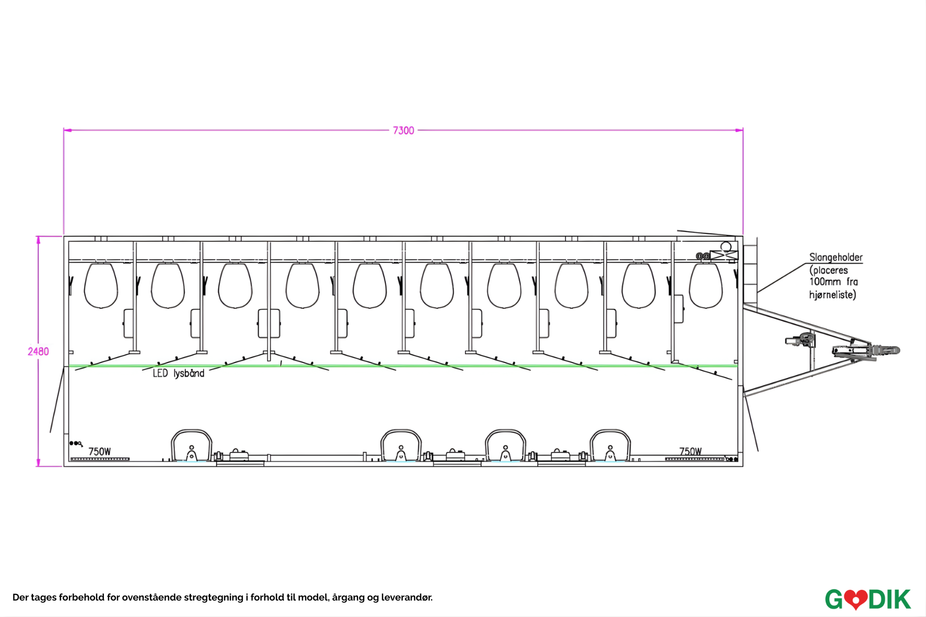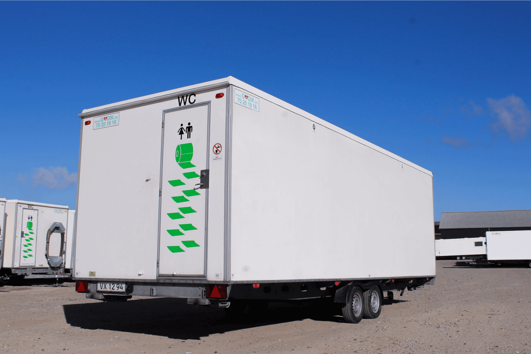Toalettvogn med standard spyletoalett. Uten tank/for tilkobling. Kapasitet på ca. 250 besøk per time.