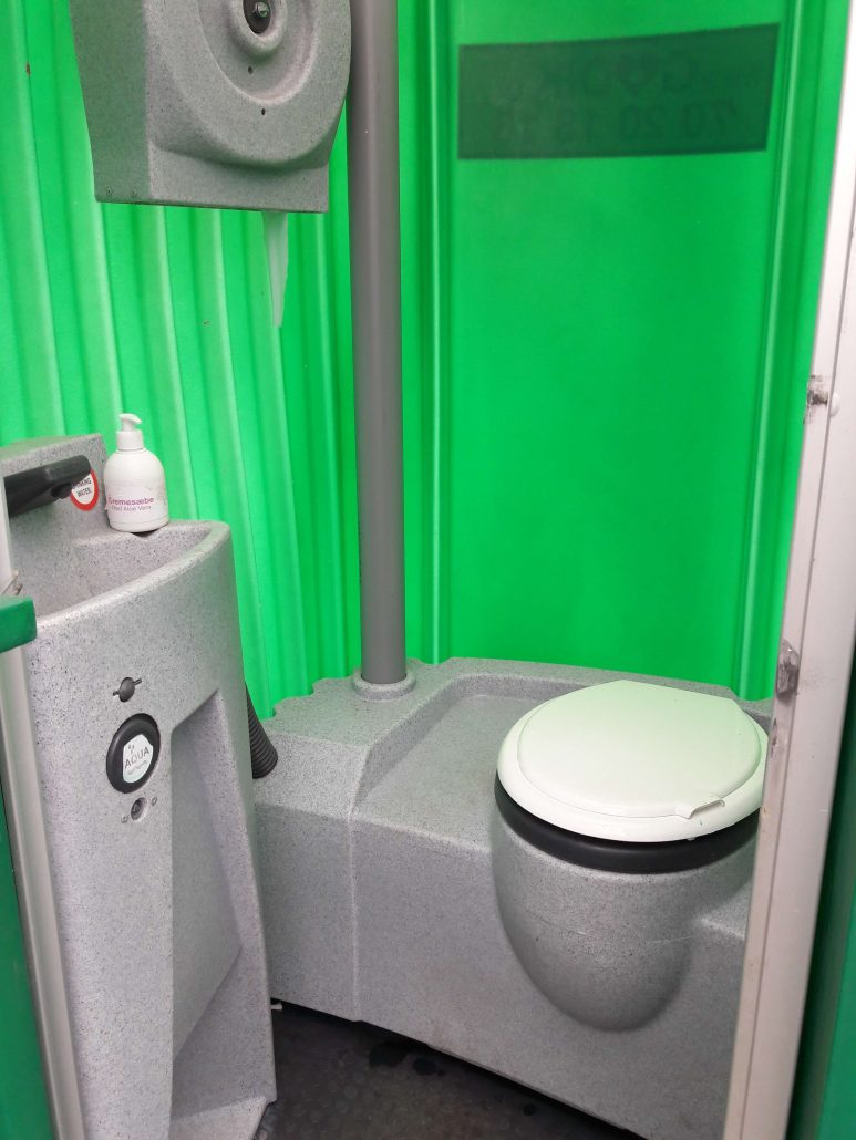 Spyletoalett med 270 l. tank, håndvask med 70 l. tank, urinal og toalettpapirholder for jumboruller 700 m. papir
