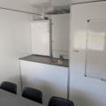 1 kjøleskap, 1 bord, 6 stoler, kaffemaskin, 1 oppslagstavle, 1 veggskap, elektriske radiatorer og LED-lys