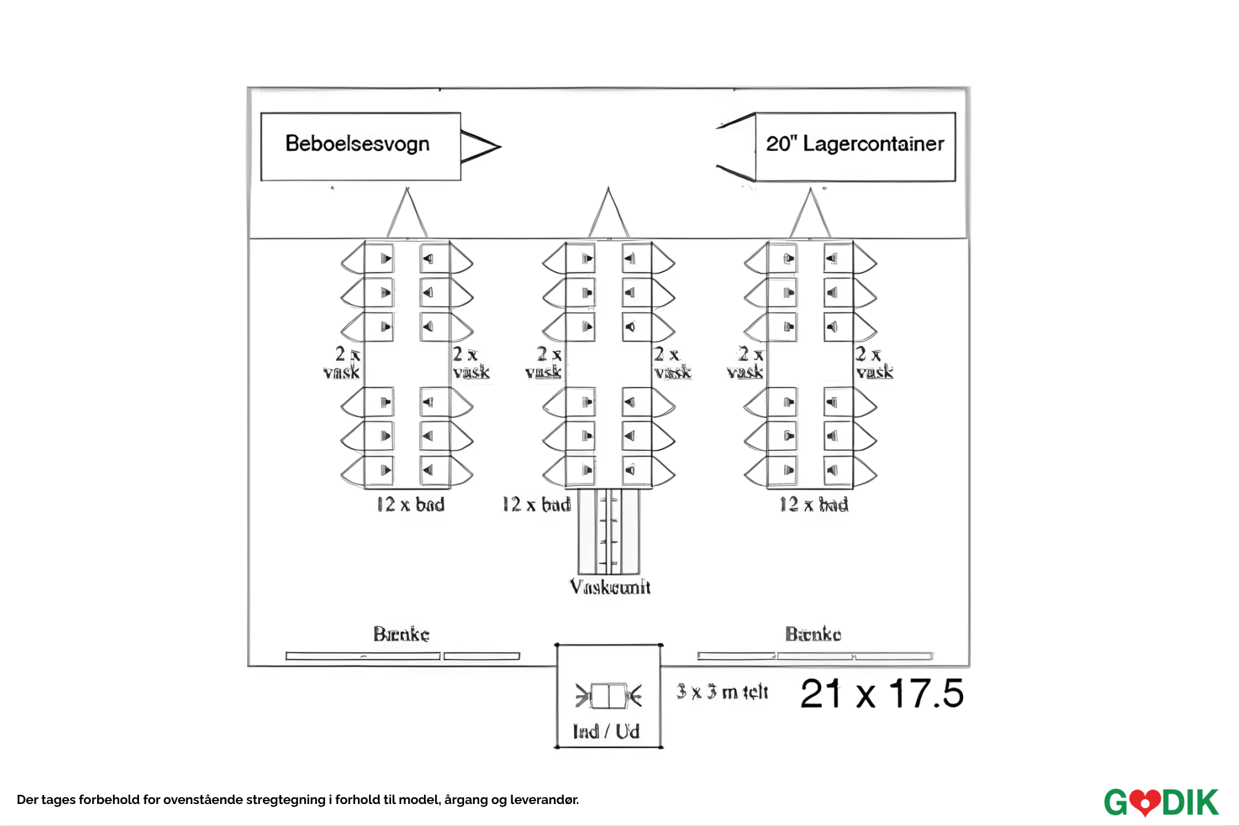 Produktet består af 3 stk. badevogn med 12 bad, 4 håndvaske, afløbspumpe og oliefyr (varenr. 03543). Herunder består produktet af indgangstelt, adgangsmøller, bænke, affaldsbeholder, hegn med hegnsug og 20" lagercontainer. Badelandet har som standard 3 badevogne. Gården kan opbygges efter ønske med 2,3 eller 4 badevogne, vaskeunits og med 3x3 meter indgangstelt, indgangsmøller, bænke, affaldsbeholder, hegn med hegnsdug, slanger og kabler.