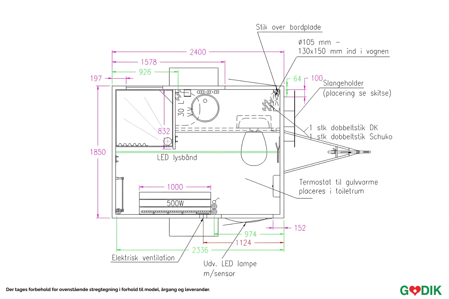 - 25 meter vandslange, afløbsslange og elkabel.