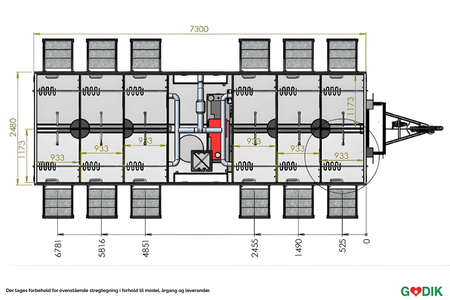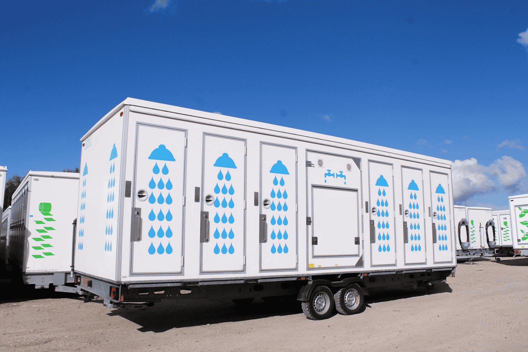 Stor badevogn med 12 dusjer og fire vasker – perfekt for festivaler og større arrangementer. Kombinasjonen av høy kapasitet og god hygiene sikrer en hyggelig opplevelse for brukerne.