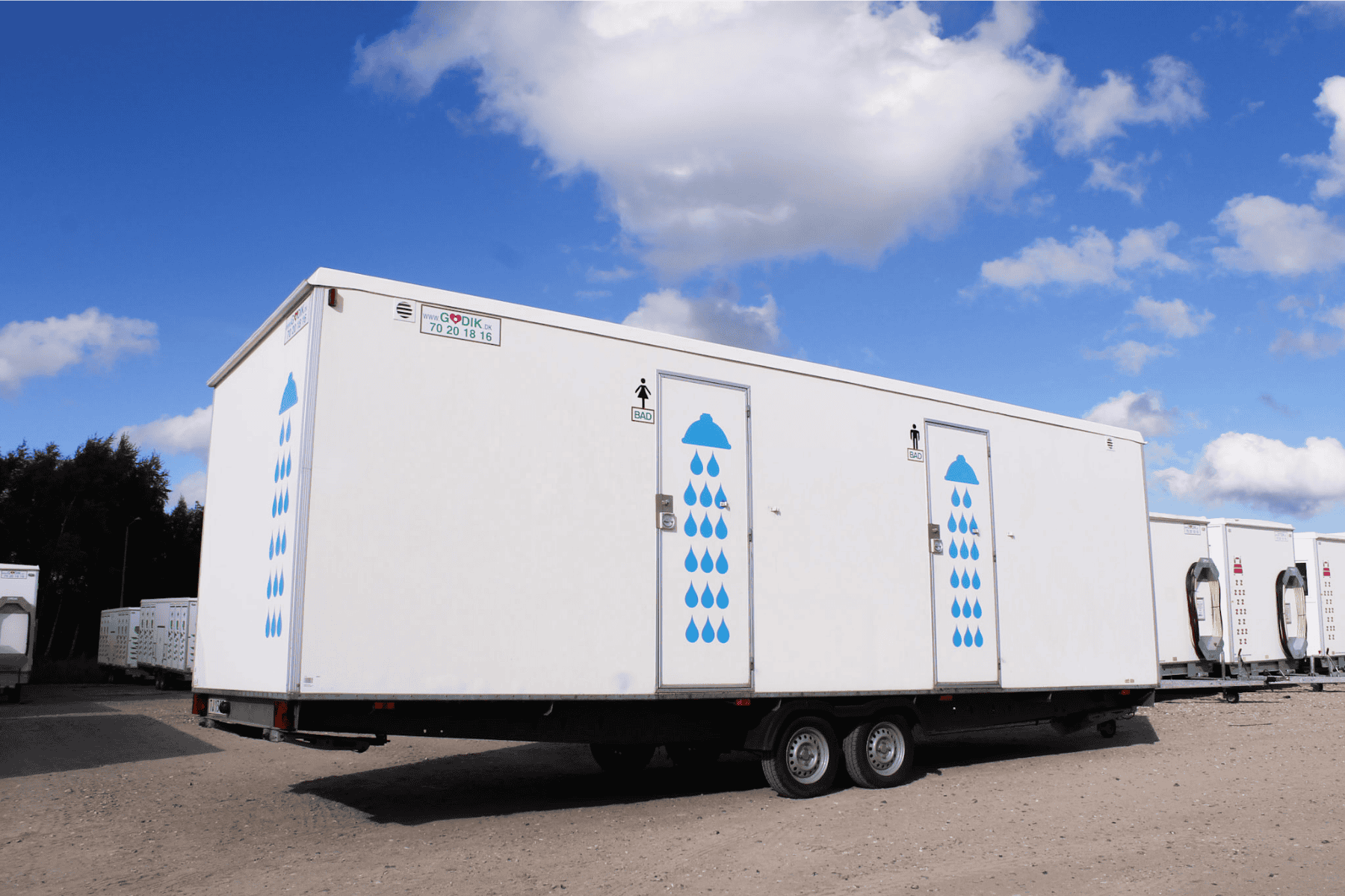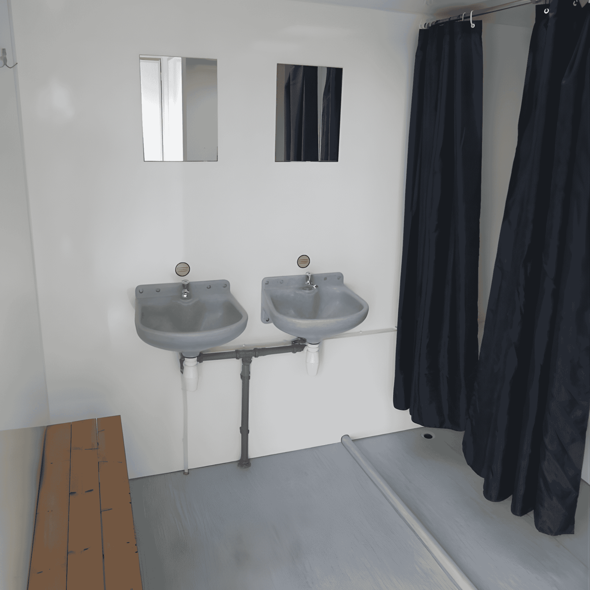 Kombinert baderoms- og toalettløsning med åtte dusjer og to toaletter. Gassoppvarming gir stabil temperatur og effektiv drift, selv under høy belastning.