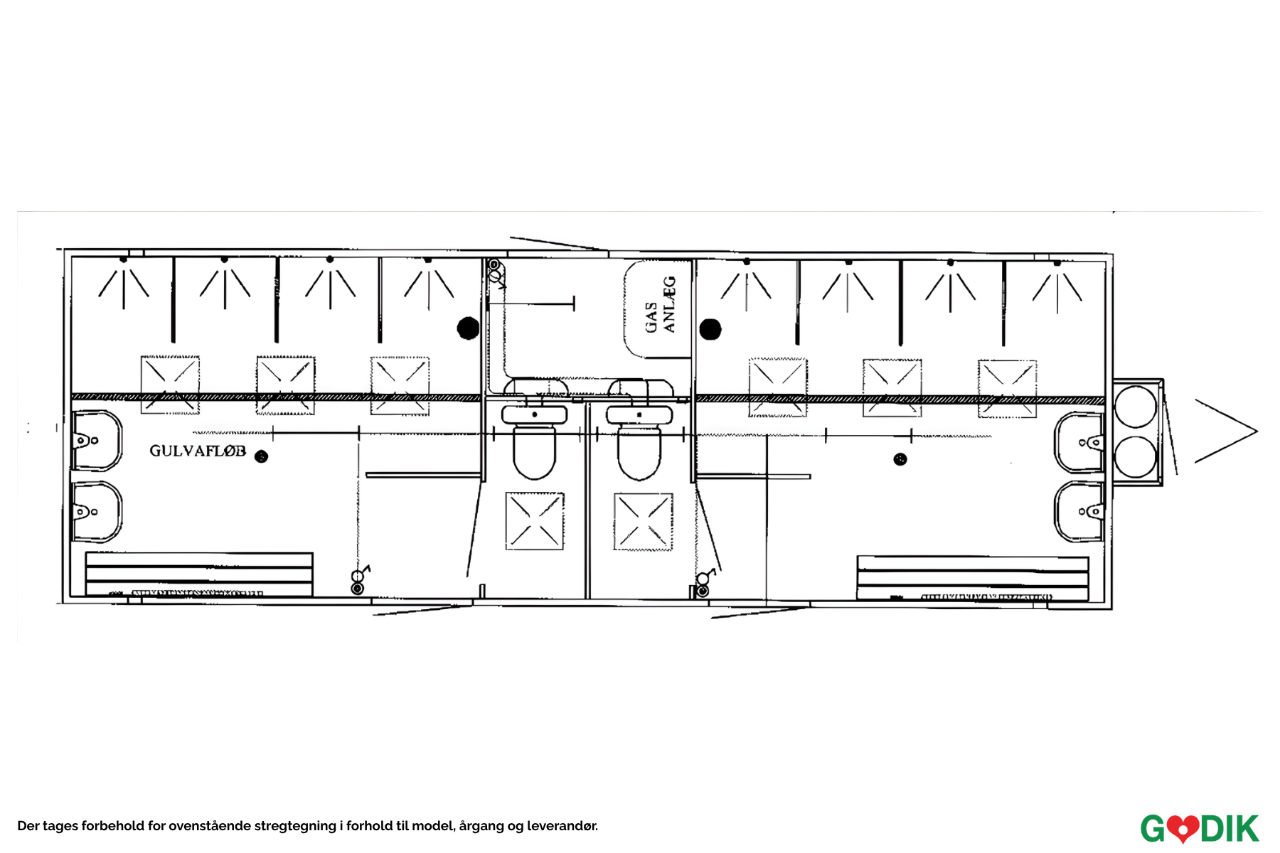 Badevogn 2 seksjoner med 4 separate bad hver. Inkludert 2 toaletter. Med gass varmtvannsbereder.