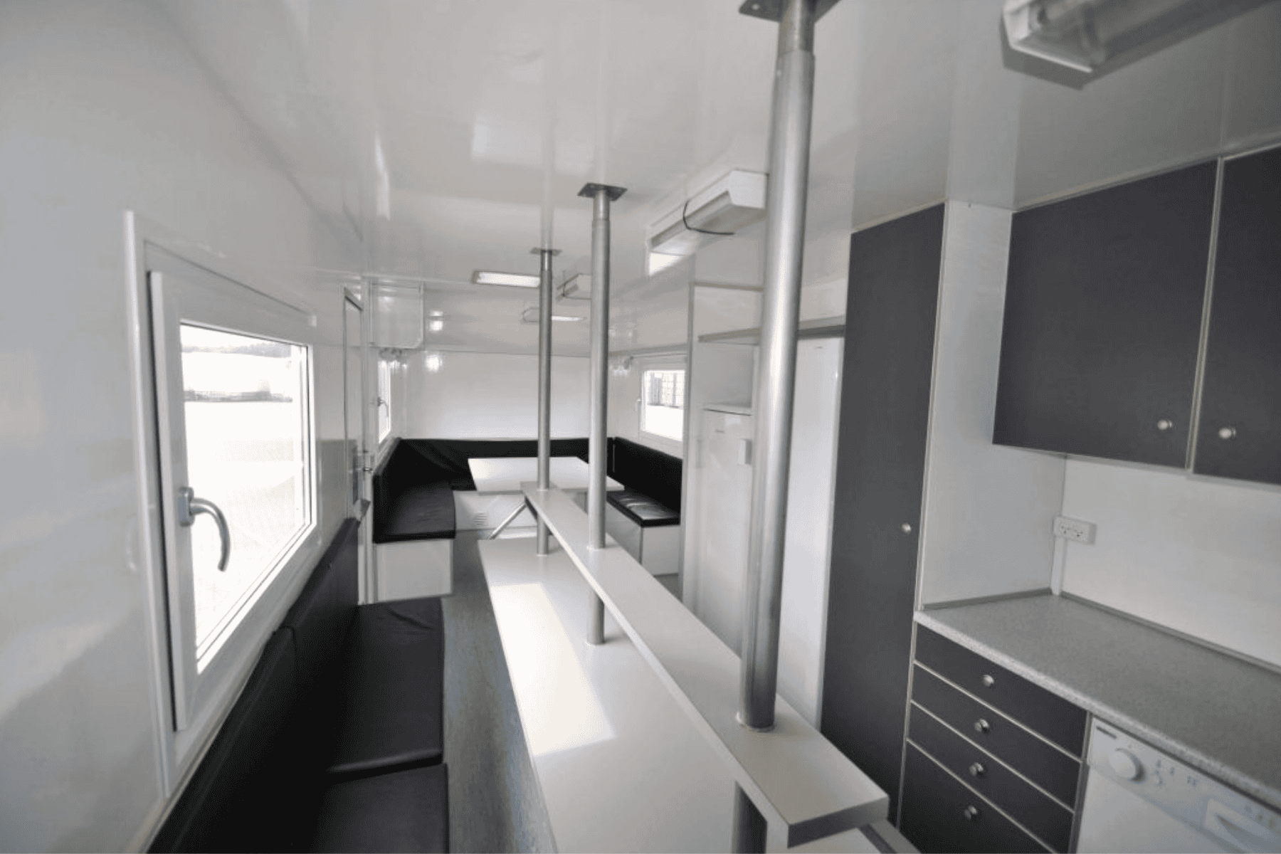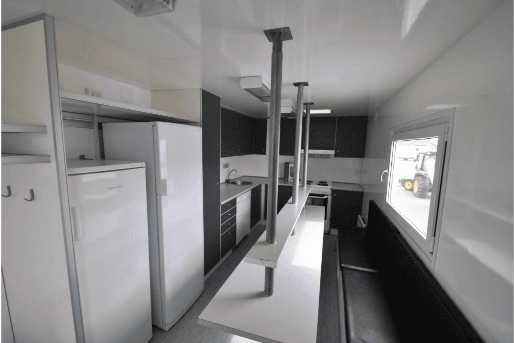 Kombinert kjøkken- og stuevogn for matlaging, spising og avslapning. Gir praktisk plass for pauser på byggeplasser eller festivaler.