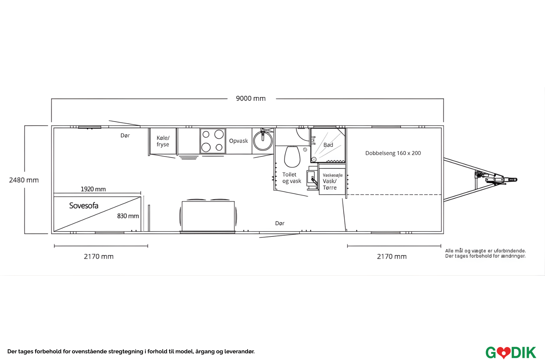 9 meter beboelsesvogn med plass til 4, kjøkken, vaskemaskin og bad/toalett