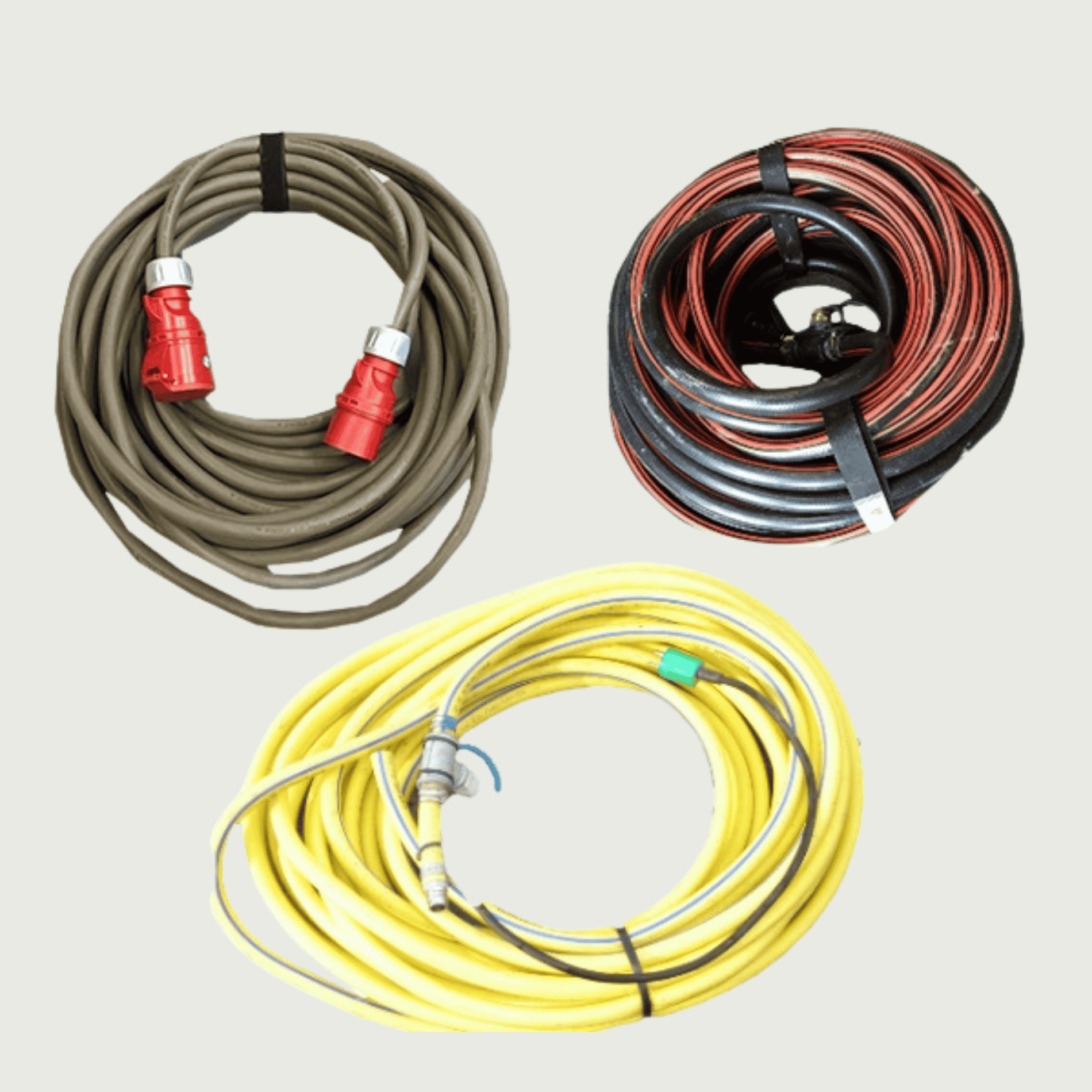 25 m vandslange 3/4" Nito kobling. 25 m afløbsslange 1" Nito kobling. 25 m elkabel 400V CEE-stik. 10 W pr. meter.