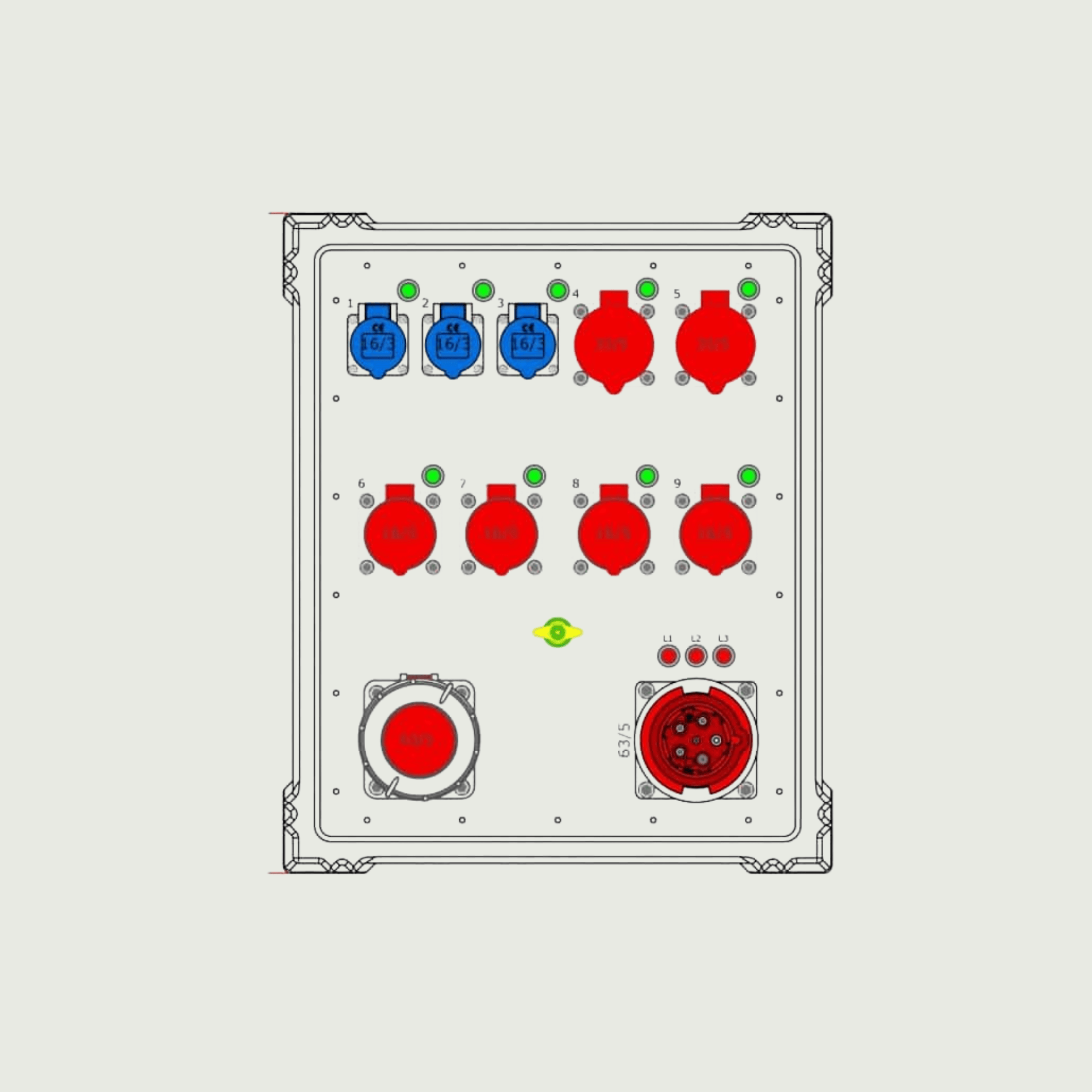 8-bokser, 1x63A, 2x32A, 4x16A, 3x230V CEE