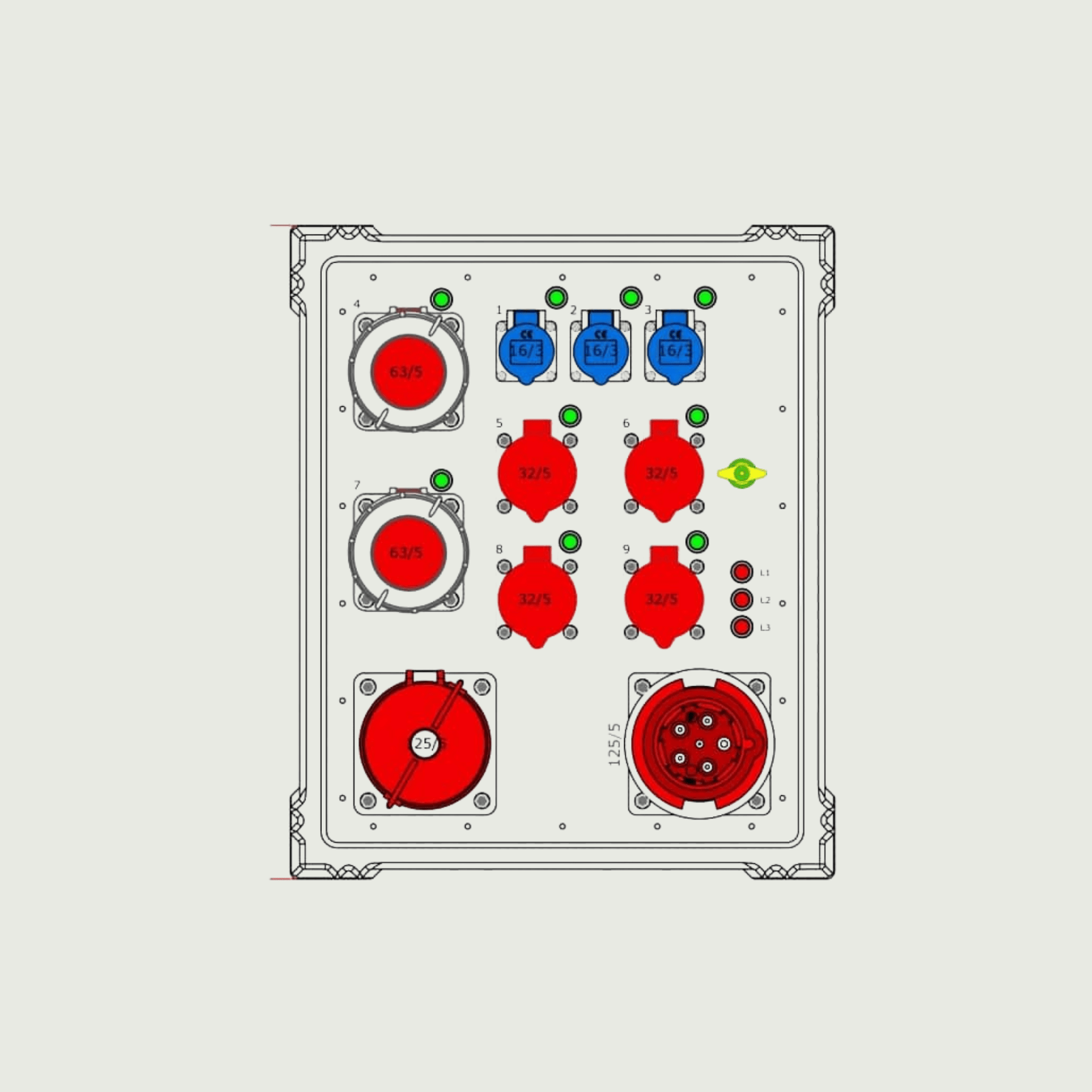 8-bokser, 1x125A, 2x63A, 4x32A, 3x230V blå CEE