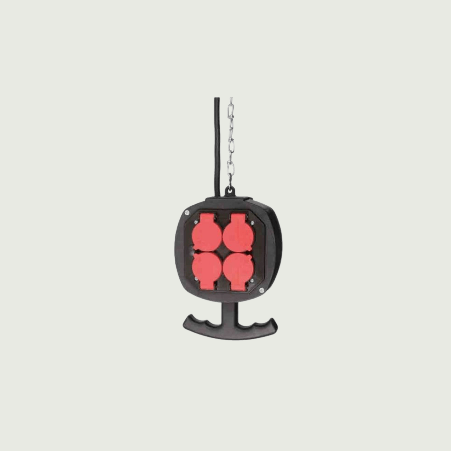 Compactfordeler Schuko 230V/16A han blå CEE til 8 stk. Schuko 230V/16A hun.Med kæde.Compactfordeleren skal indstilles til den ønskede arbejdshøjde.Inkl. 3 meter stabil, zinkbelagt stilkæde og 2 meter kabel.
