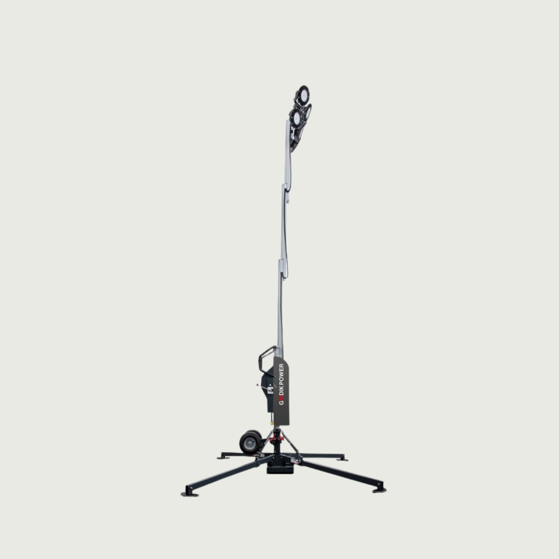 6.5 meter masthøjde.Let at transportere med gaffellommer og hjul.4 maste sektioner, 6 LED lamper.Total lumen 244800.360 graders belysning.