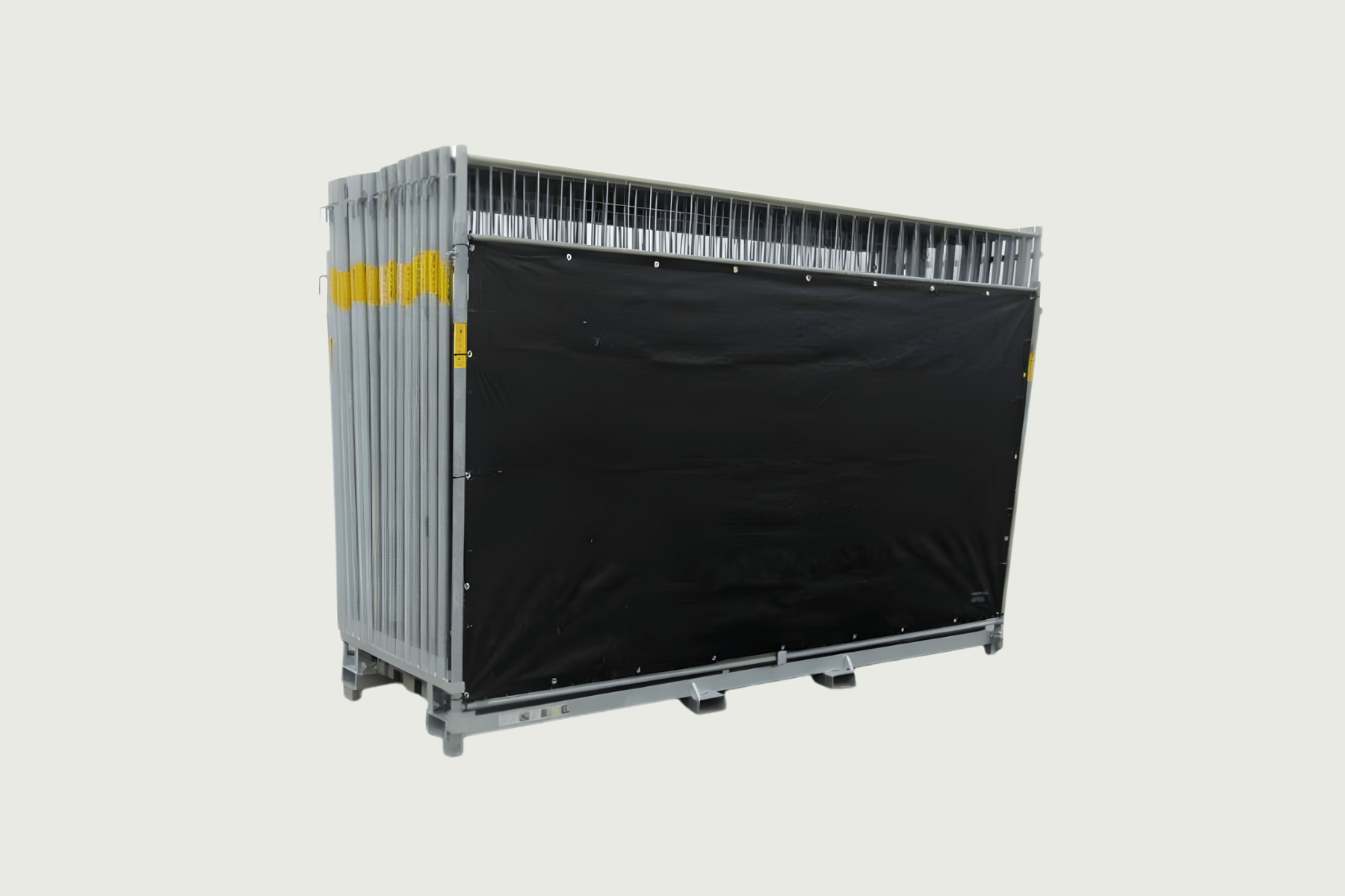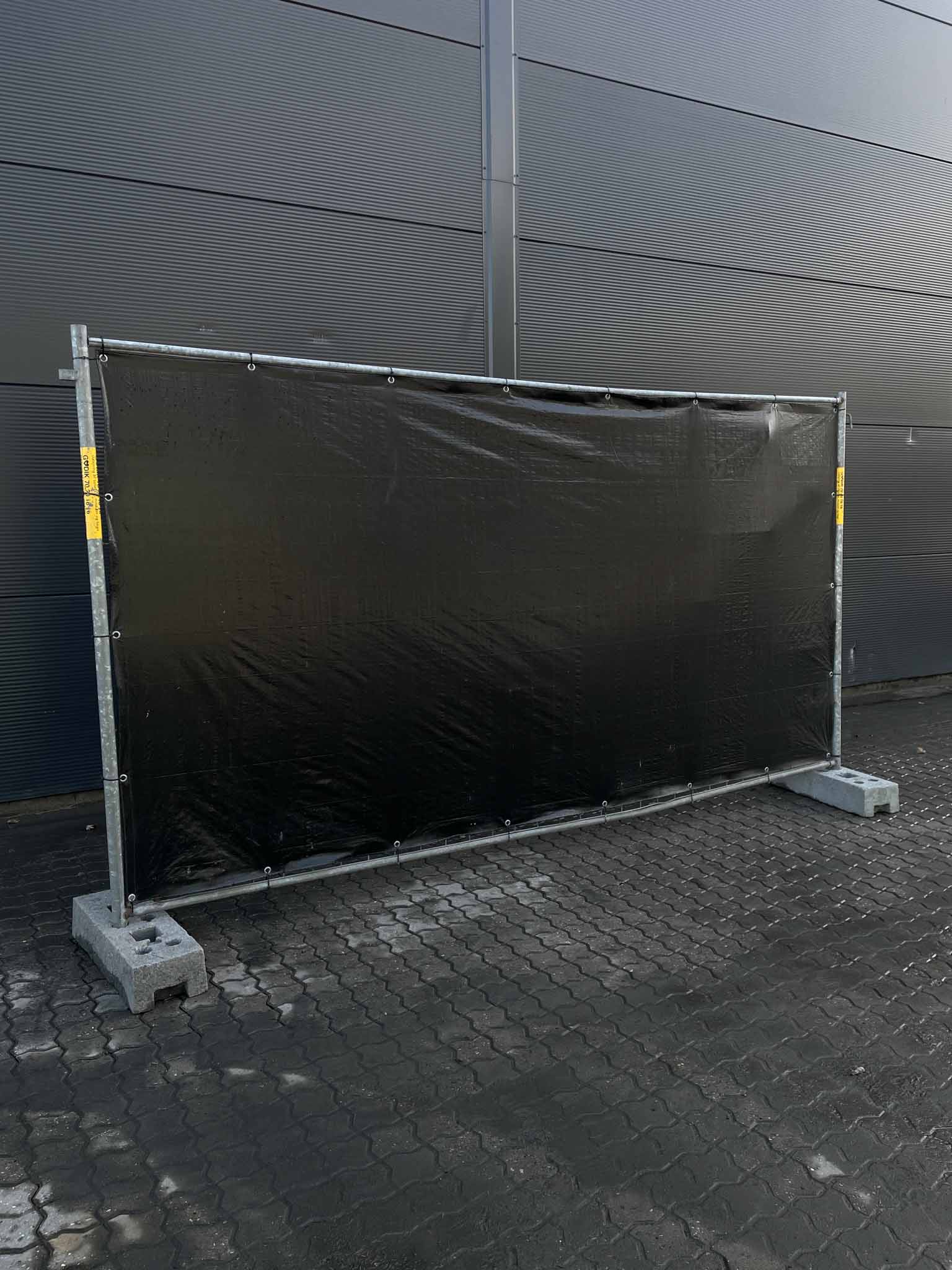 - 1 palle højt hegn med sort brandhæmmende hegnsdug påsat. Mål 1 stk. hegn: H: 200, L: 350 cm. Vægt pr. stk.: 21 kg. Mål 1 stk. klods: H: 14, L: 68, B: 25 cm. Vægt pr. stk.: 26 kg.