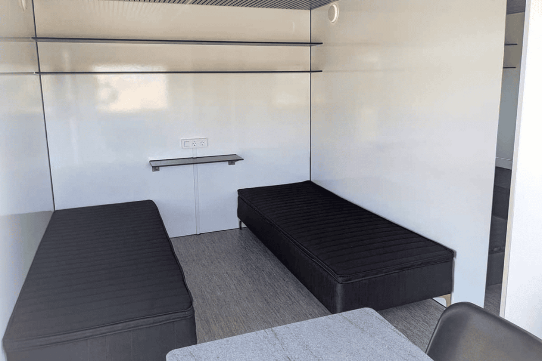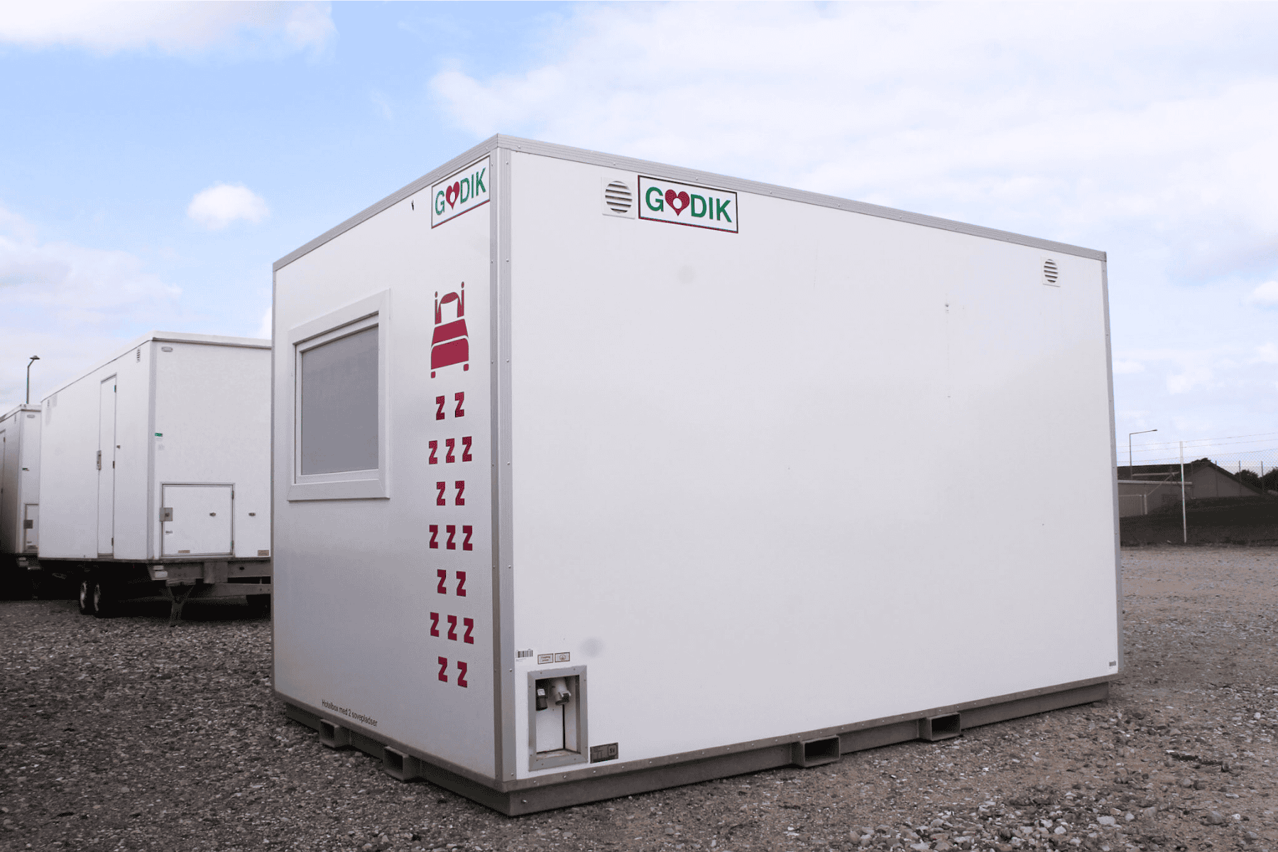 Komfortabel hotell-/innkvarteringsmodul med 2 senger, kjøleskap og gulvvarme.