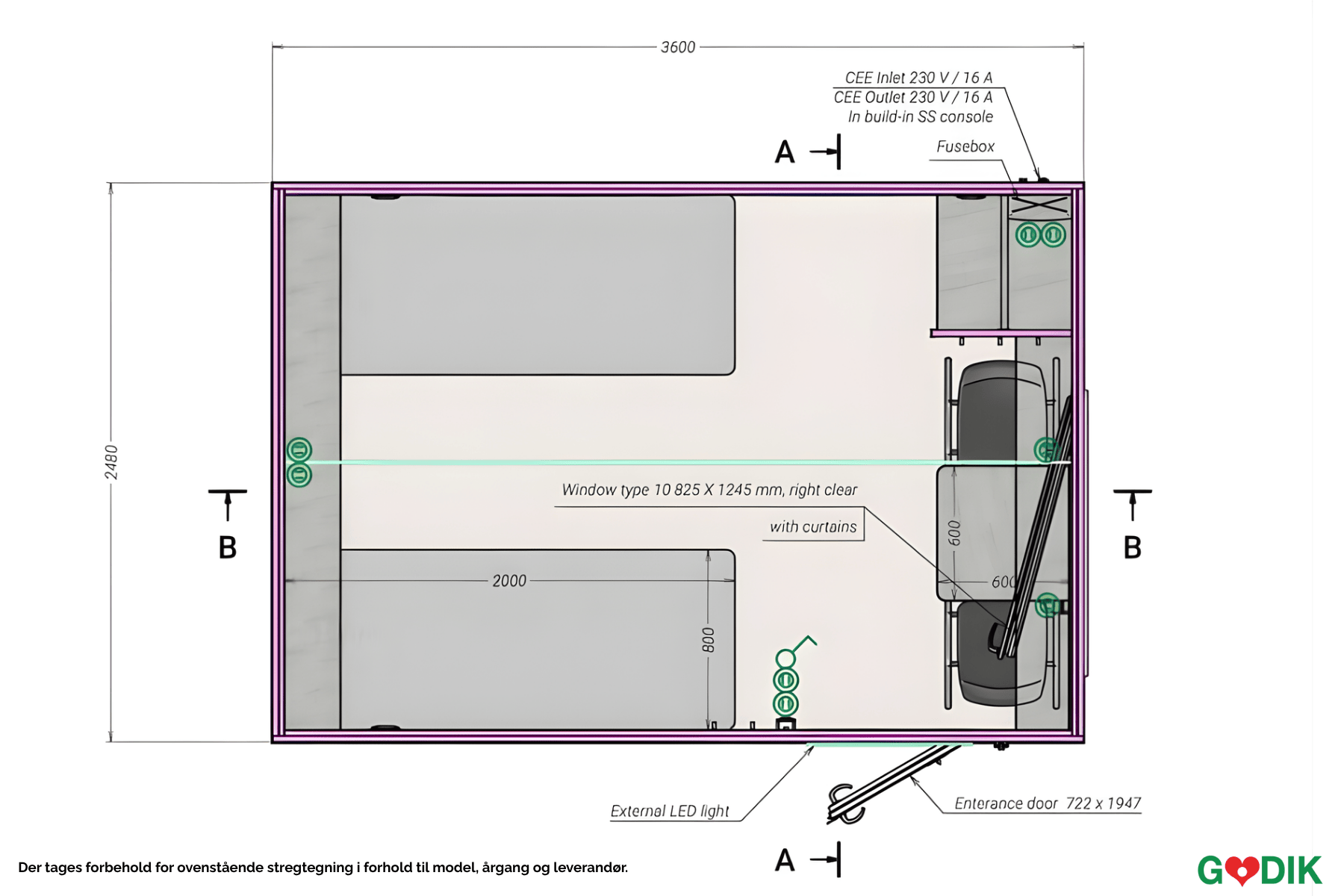 LED-lys inne og ute, lys med sensor, 2 boksmadrasser, kjøleskap, 2 stoler, sammenleggbart bord, hyller, 5 kroker, lydisolert takbelegg, gulvvarme.