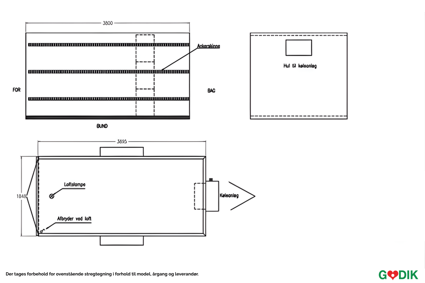 Højde mål: Model 1: udv. 265/indv. 200. Model 2: udv. 248/indv. 181 cm. Længde mål: Model 1: udv. 395/indv. 378. Model 2: udv. 420/indv. 408 cm. Bredde mål: Model 1: udv. 185/indv. 170. Model 2: udv. 234/indv. 170 cm. Opstilling: Trailer skal stå lige/i vater.