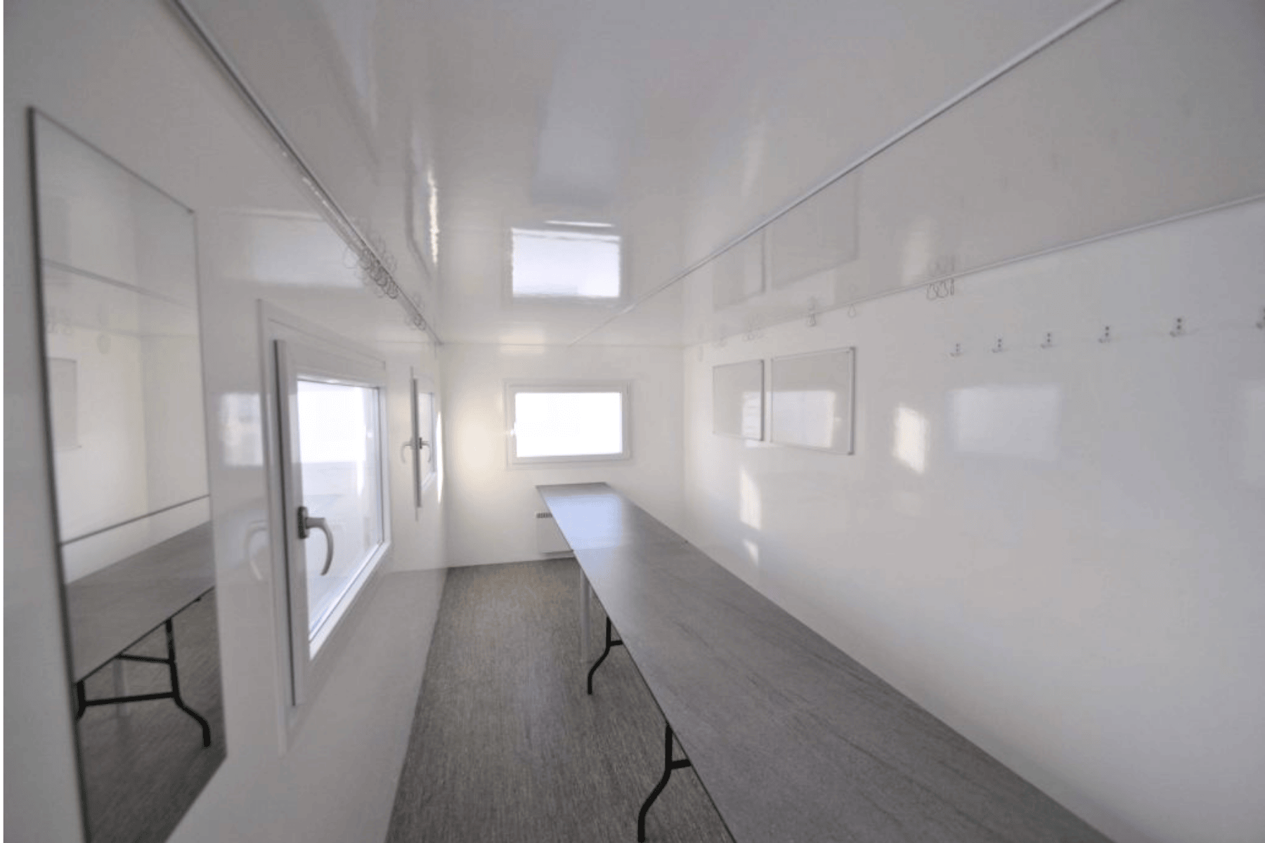 Stor kontorvogn med ett åpent rom for opptil 16 personer. Perfekt for byggeplasser eller midlertidig administrasjon.