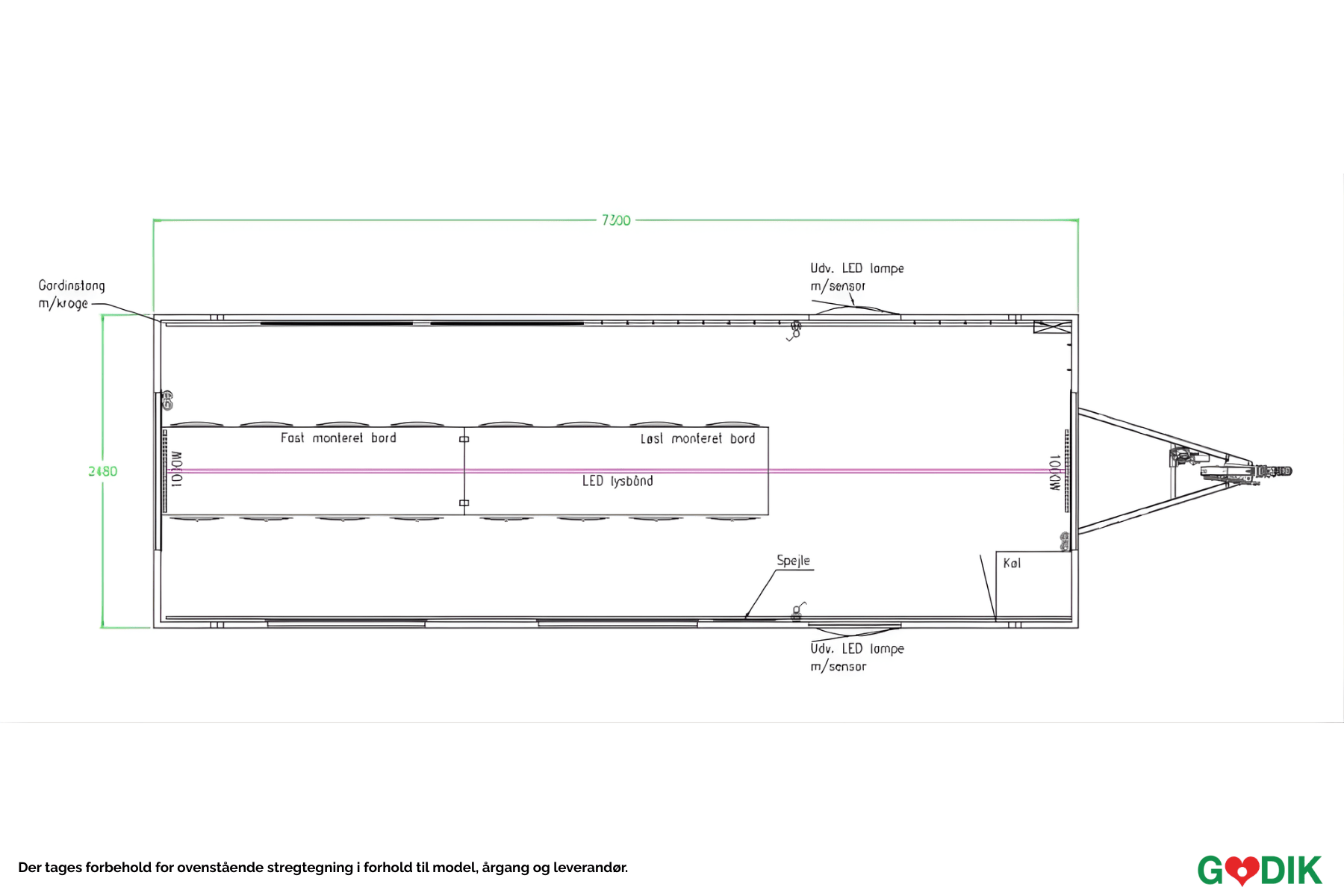 1 rum med knagerække, 2 spejle, 2 borde, 16 stole, køleskab, 2 opslagstavler, 2 el-radiatorer, stikkontakter, 4 oplukkelige dreje/kip vinduer, rullegardin.