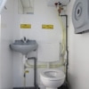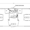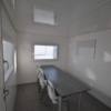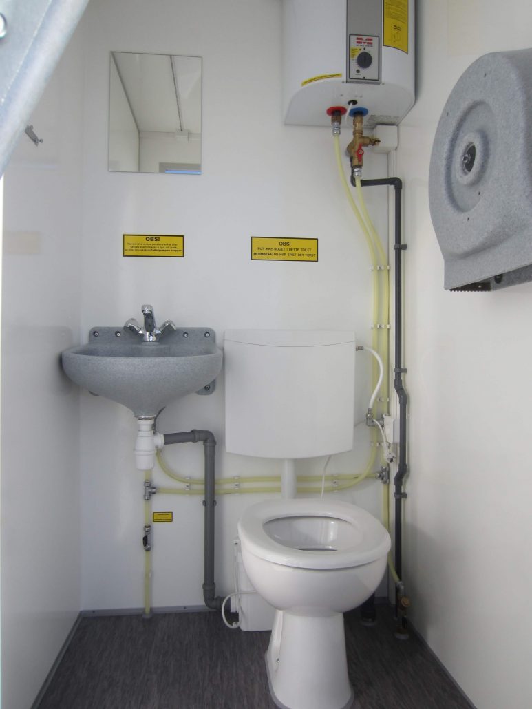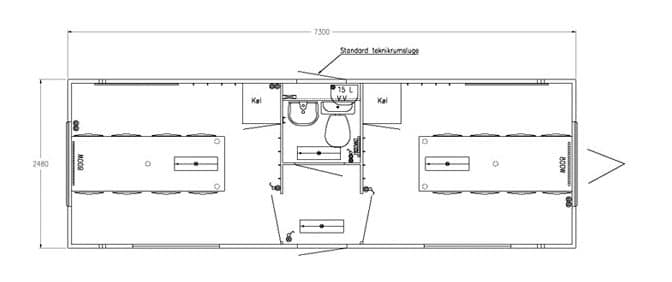 2 kjøleskap, 2 bord, 16 stoler, toalett, vask, varmtvannsbeholder, 2 speil, 2 oppslagstavler, rullegardiner og elektriske radiatorer.