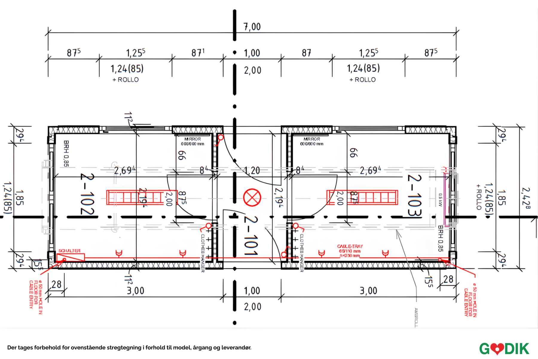 2 rum, el-radiator, lysarmaturer, el-udtag 230V, oplukkelige vinduer, spejl.