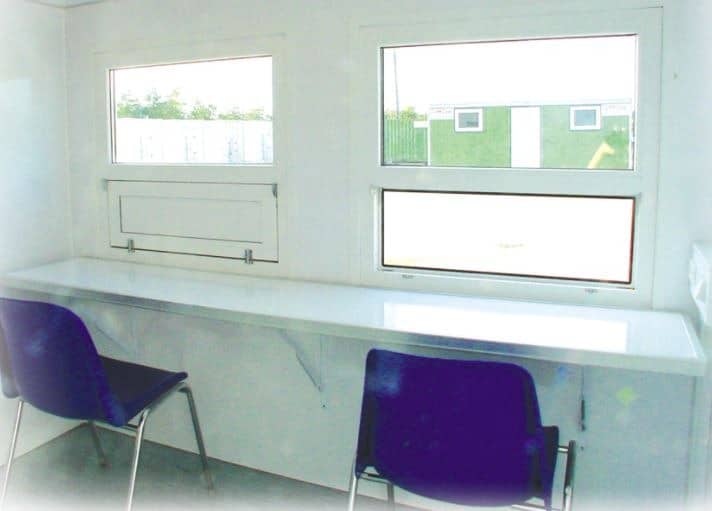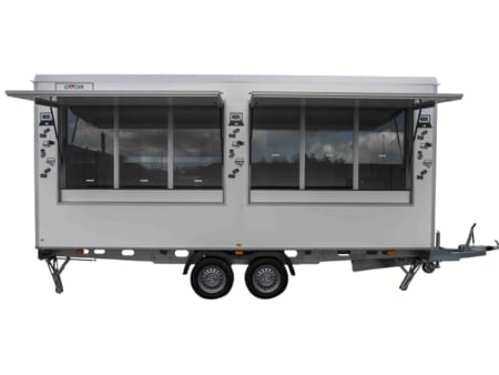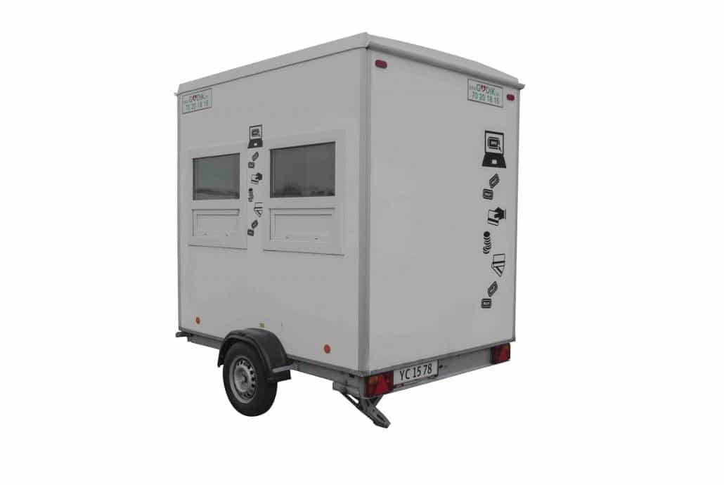 - Kapasitet: 2 salgsluker med disk, hyller over bordplate og 2 stoler