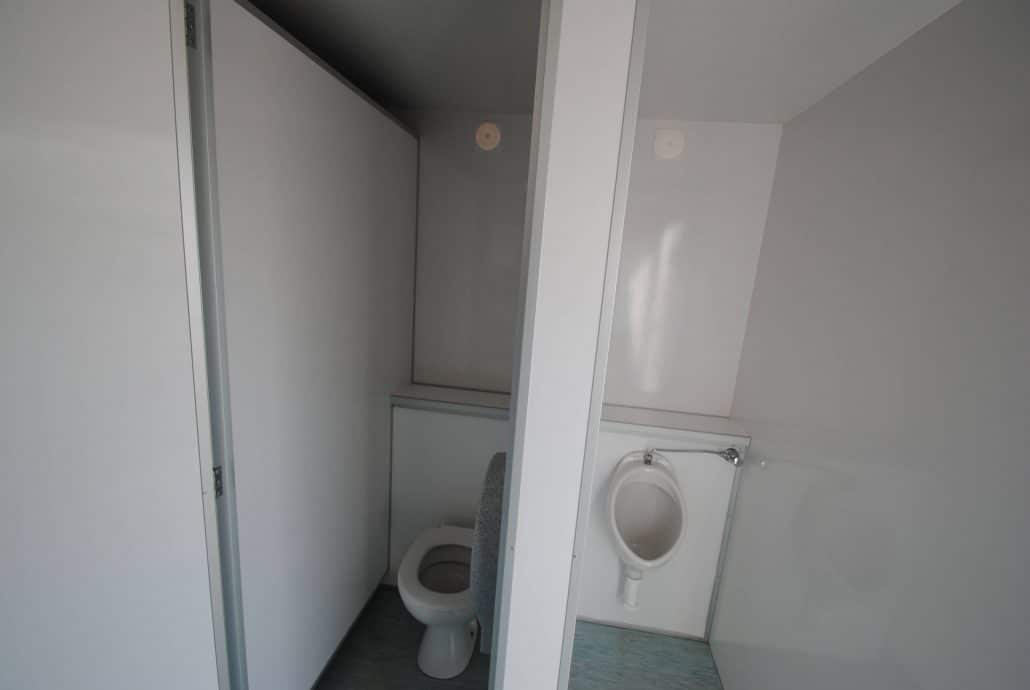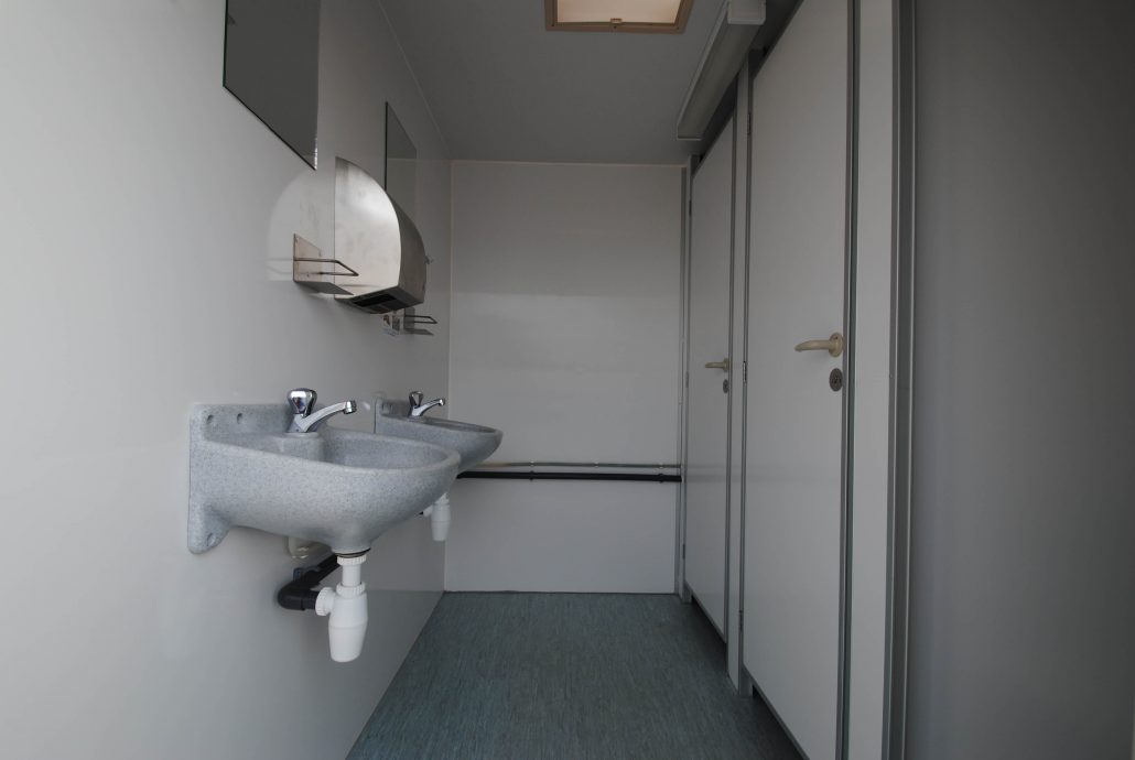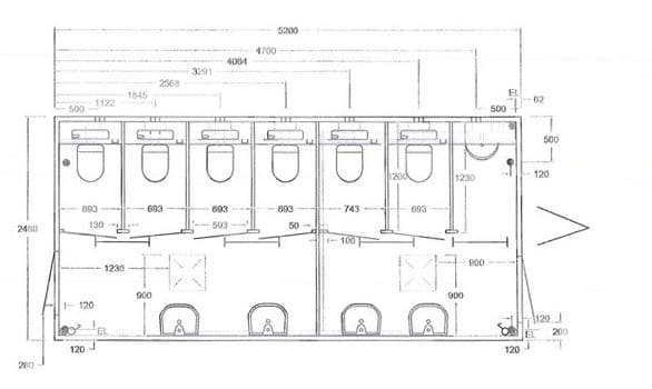 4 dametoaletter, 2 herretoaletter, 1 urinal, 4 servanter, 2 håndtørkere, speil, dameveskeholder og toalettpapirholder.