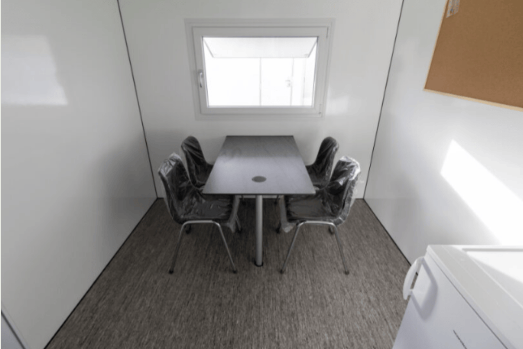 1 bord, 4 stoler, kaffemaskin, bad med toalett og avløpskvern, kjøleskap, separat garderobe (for arbeidsklær og rene klær), 8 stålskap (4 skap i hver sone), oppslagstavle, kleshengere, 3 vasker med håndfrie kraner, 2 benker.