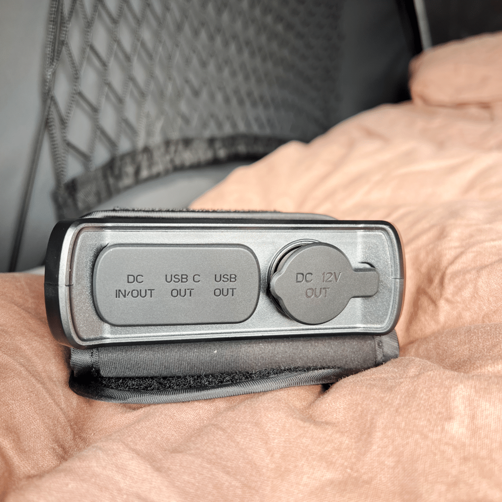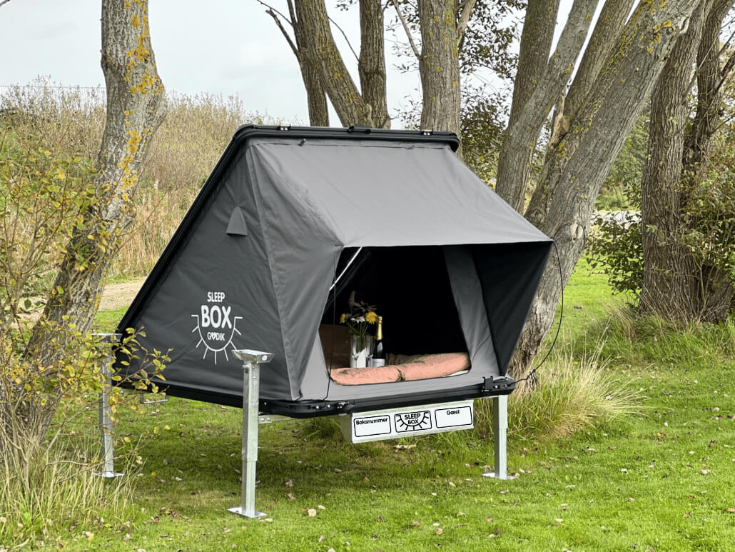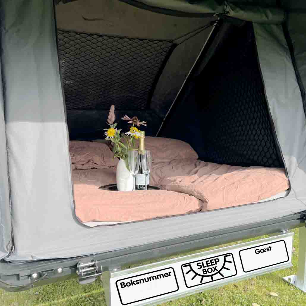 2-manns skummadrass, 3 innvendige bagasjenett, 2 LED-lamper og låseboks med hengelås. Soveboksens solceller leverer en batteripakke med 12V, USB og USB C-uttak for lading av mobiltelefoner, lydbokser mm.