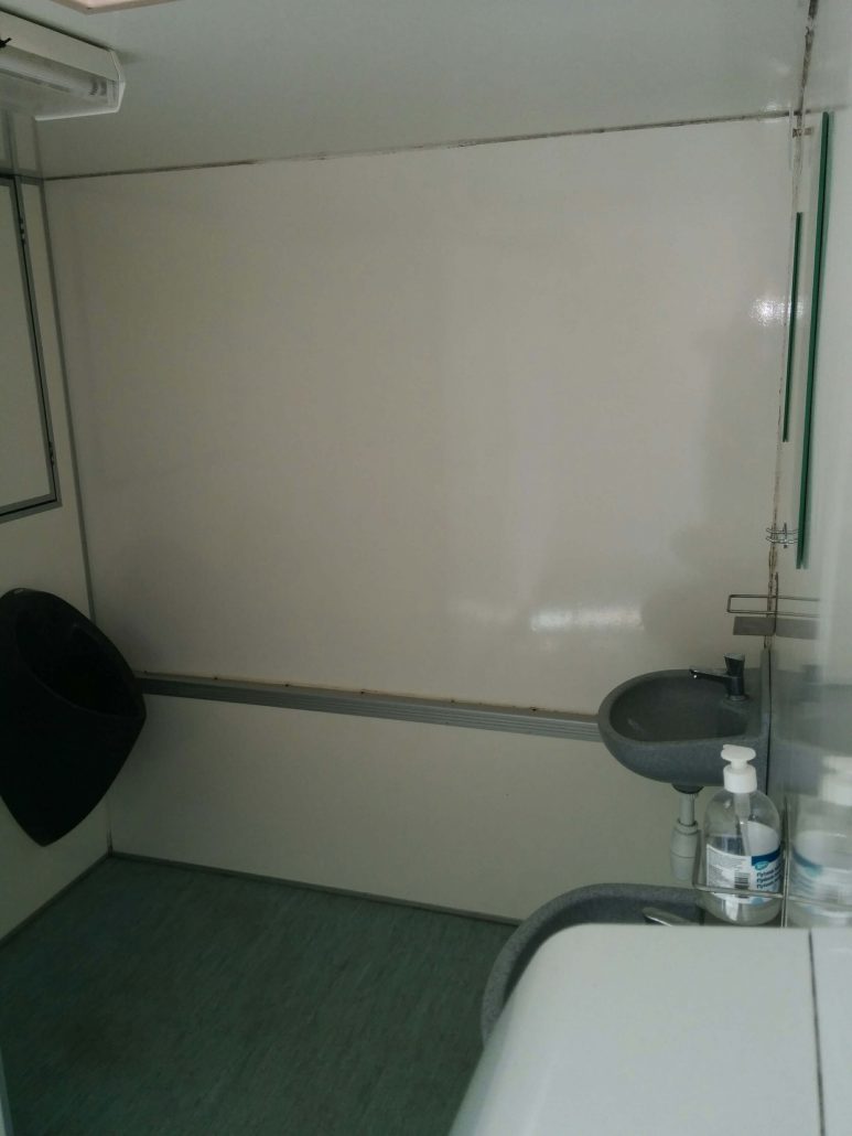 4 dametoaletter, 3 herretoaletter, 2 urinaler, 4 vasker, 2 håndtørkere, speil, jumbo toalettpapirholdere, dameveskeholder