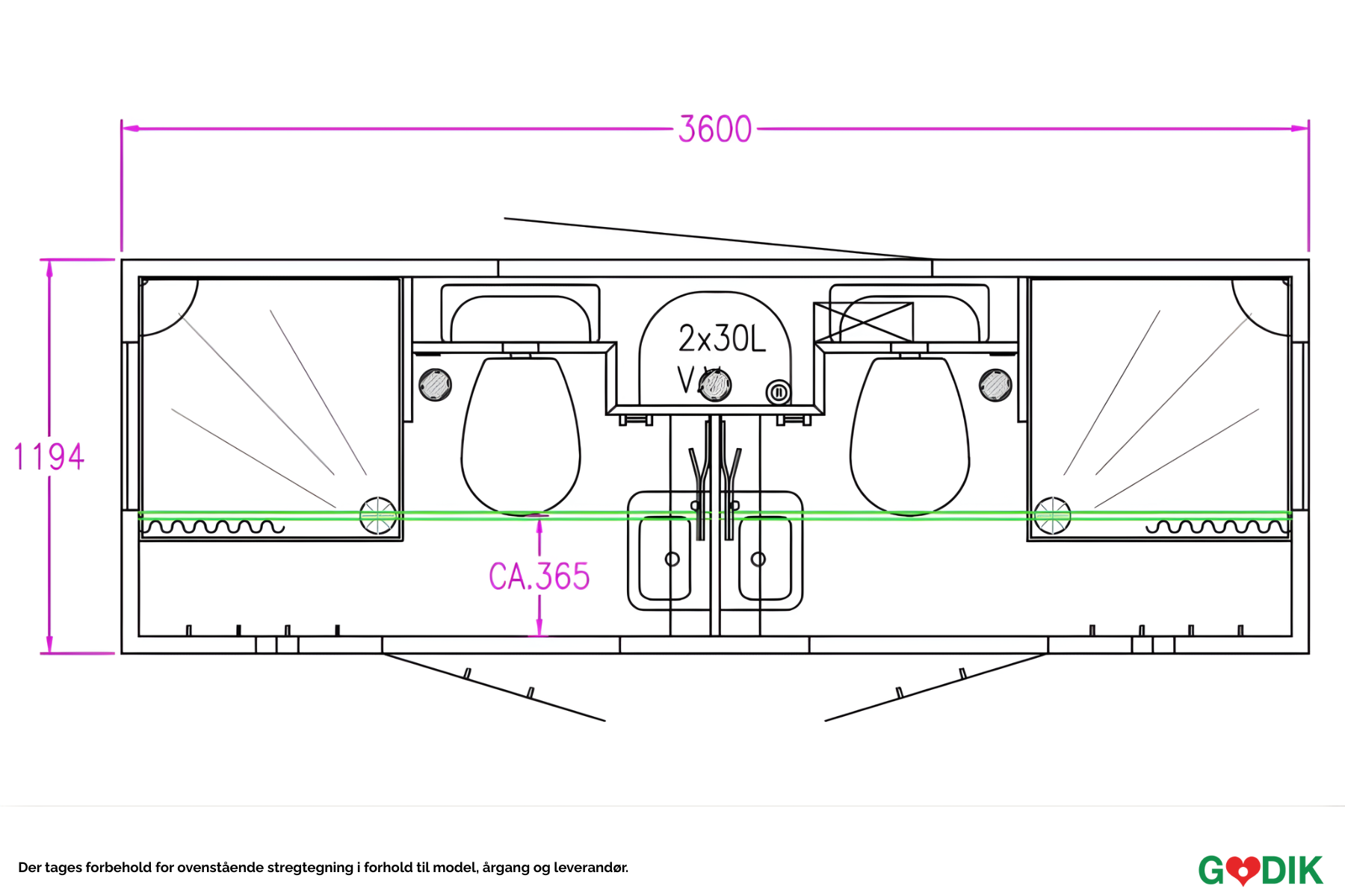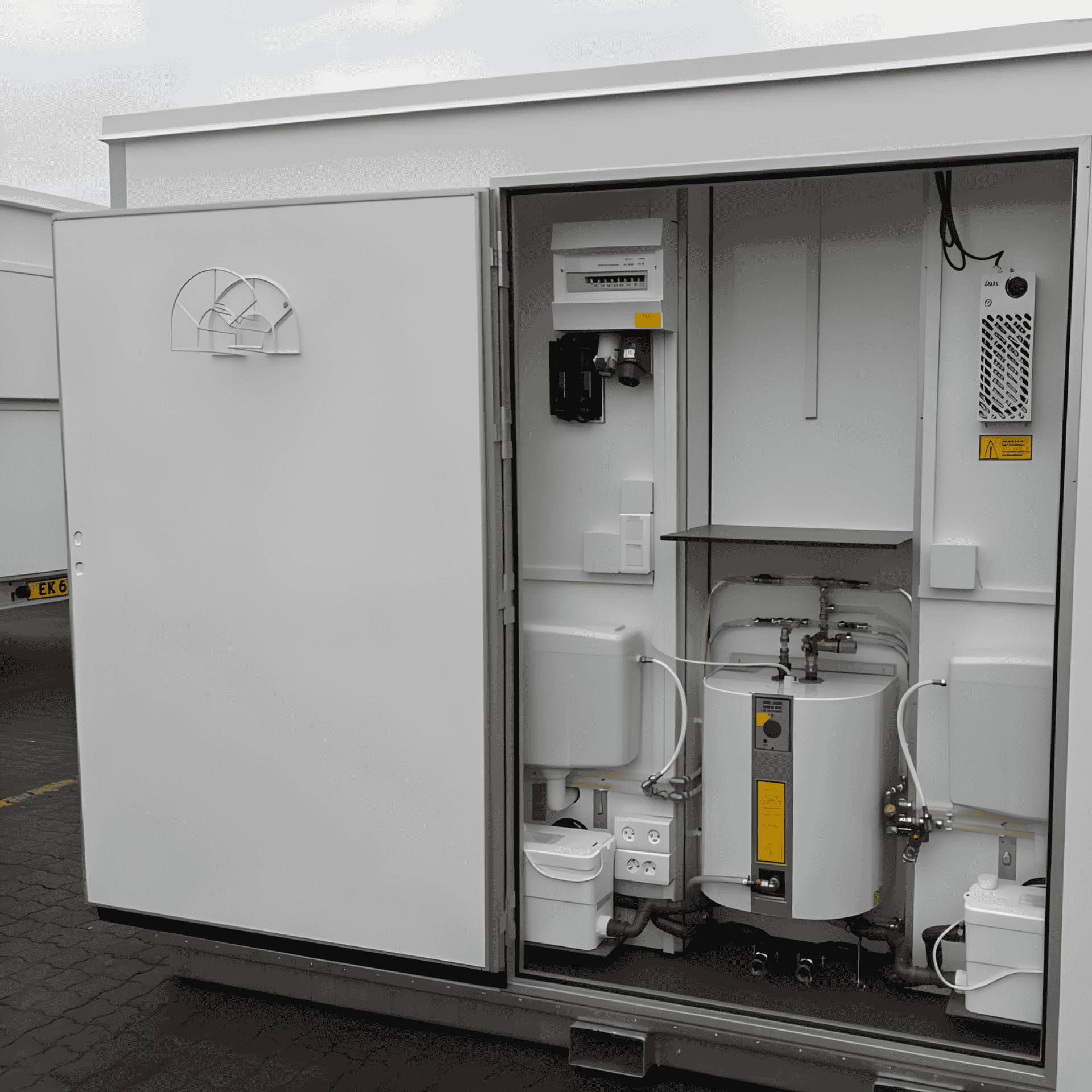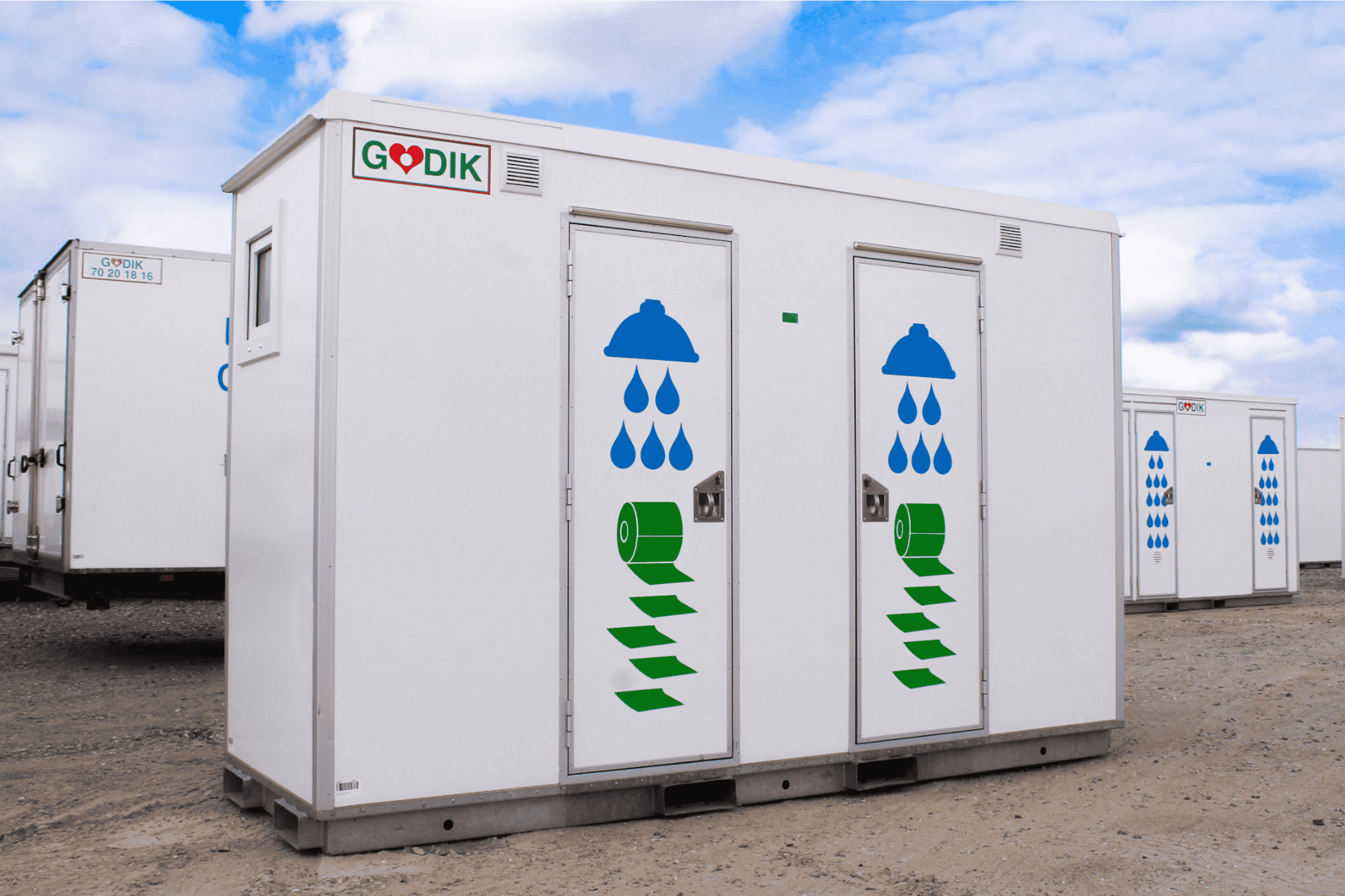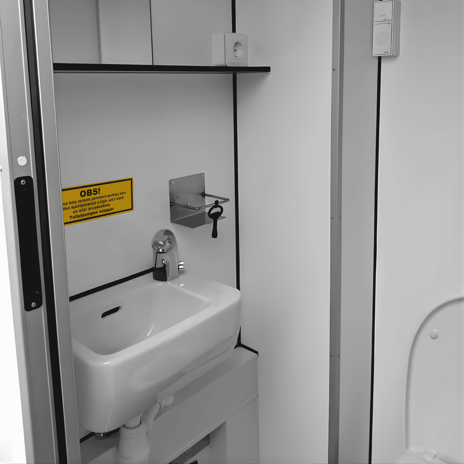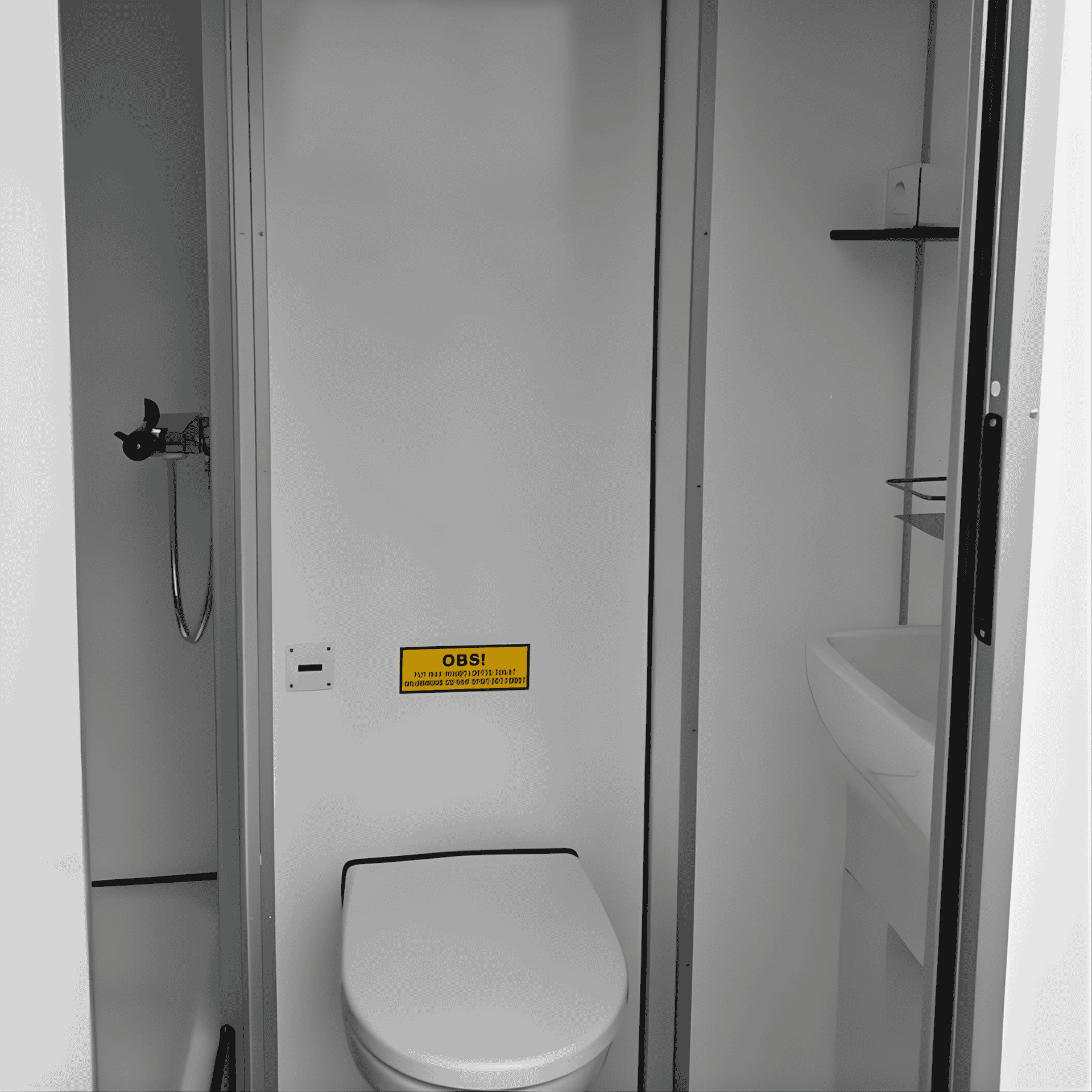 Kompakt baderomsmodul med to fullt utstyrte bad – ideelt for arrangementer, festivaler eller midlertidige opphold. Leveres klar til bruk med tilkobling til vann og avløp. Godik tilbyr oppsett og service i hele leieperioden etter avtale.