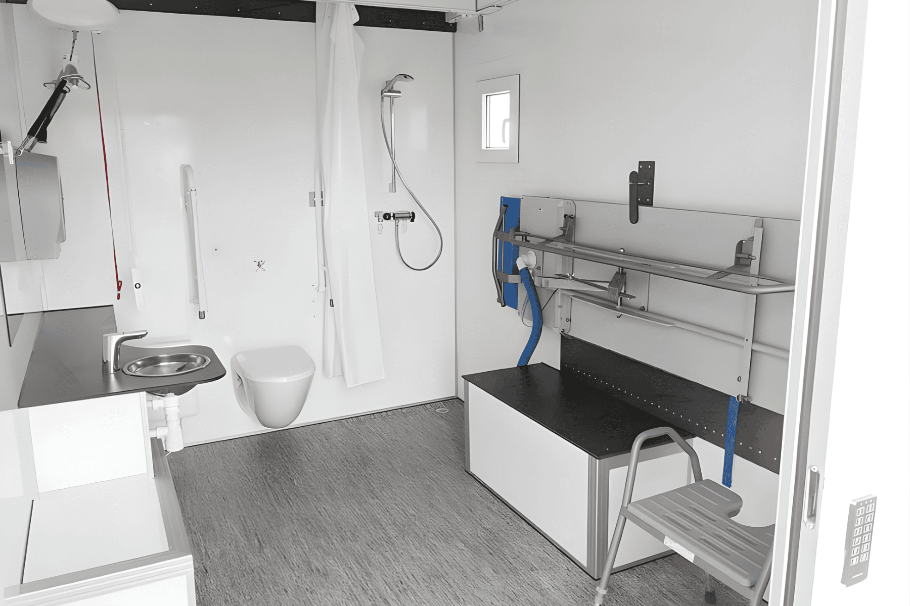 Handikaptoalett med integrert tank, servant, dusj og traversløfter. Gir full funksjonalitet og høy hygiene, selv uten fast tilkobling.