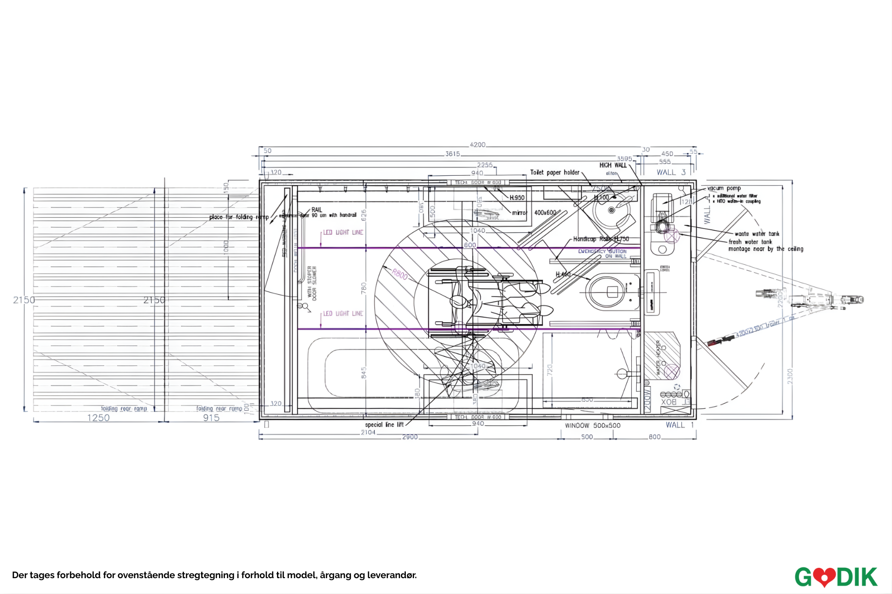 Handikapvogn med vakuumtoalett med tank. Inkluderer servant, dusj og heis. Med senkbar aksel.