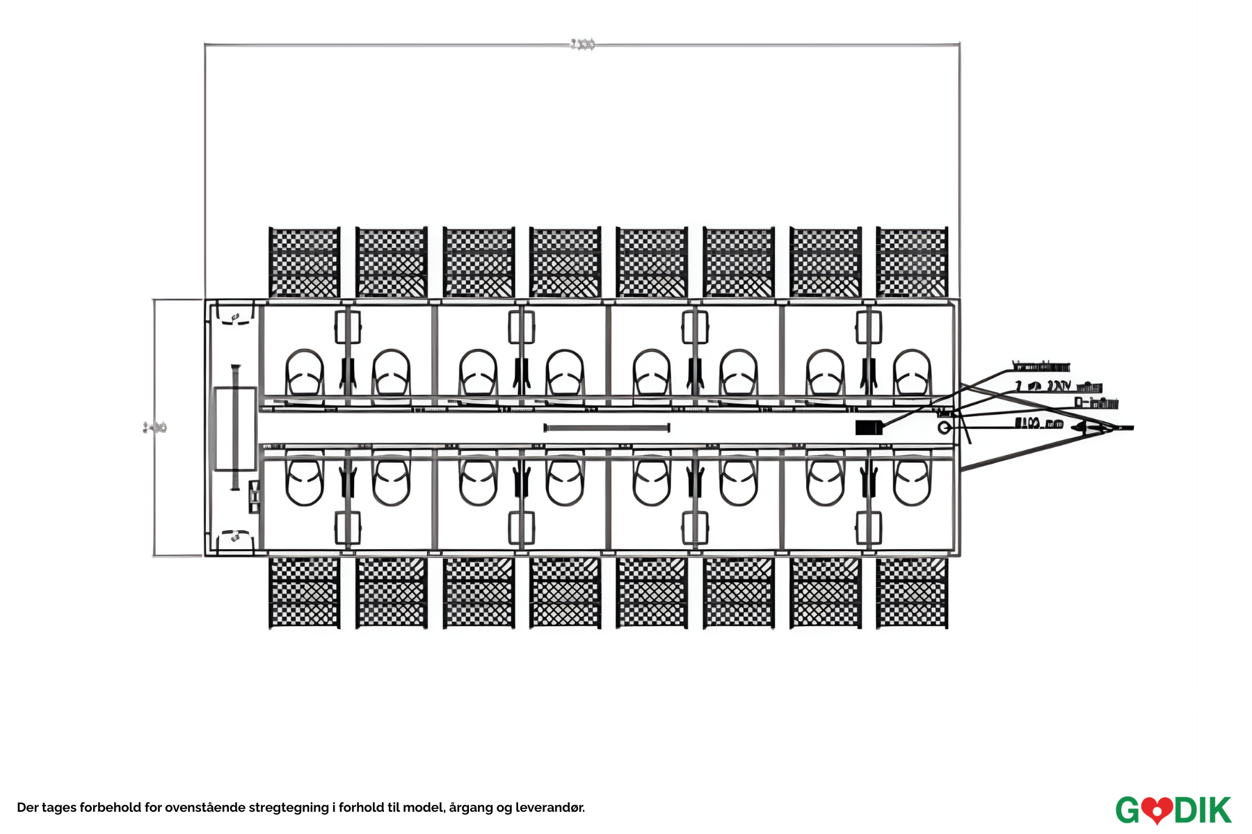 LED lamper udv. og indv., dispenser holdere for Alcogel 0,3 L, lysindikator for fri/optaget ved indgangsdør, spejl, toiletpapirholder, madameposeholder, knager, fastmonterede trapper med gelænder. Kan påføres banner i enden med kæder i top og bund, højde: 153 cm, bredde: 198 cm.