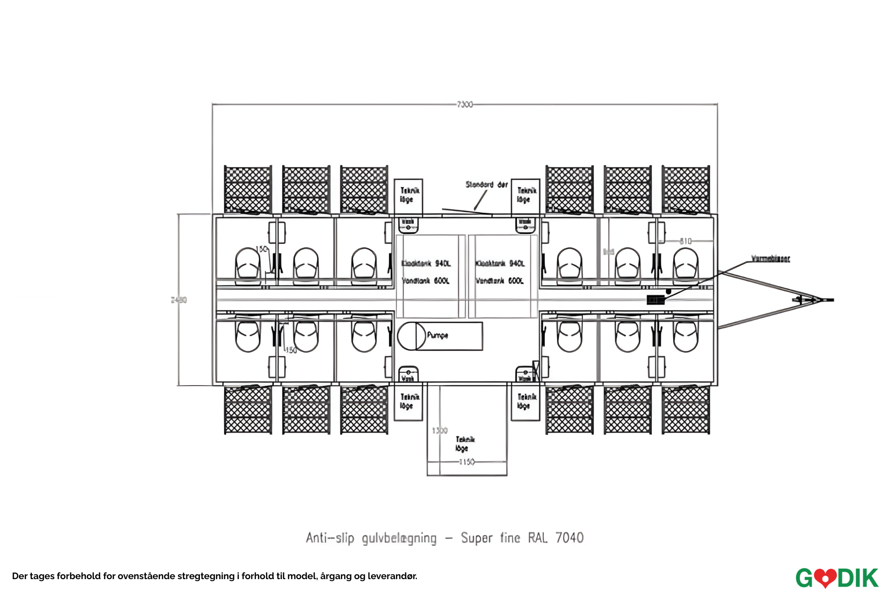 Toalettvogn med tank og 12 vakuumtoaletter. Tankkapasitet for ca. 2000 besøk. Kapasitet på ca. 300 besøk per time.