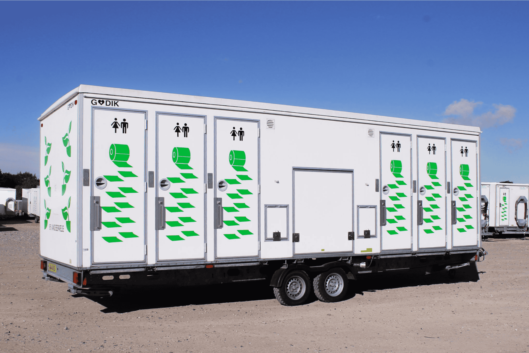Vakuumtoalettvogn med 12 toaletter og fire vasker på utsiden. Designet for høy kapasitet og god hygiene ved større arrangementer. Godik leverer, monterer og utfører service for problemfri drift.
