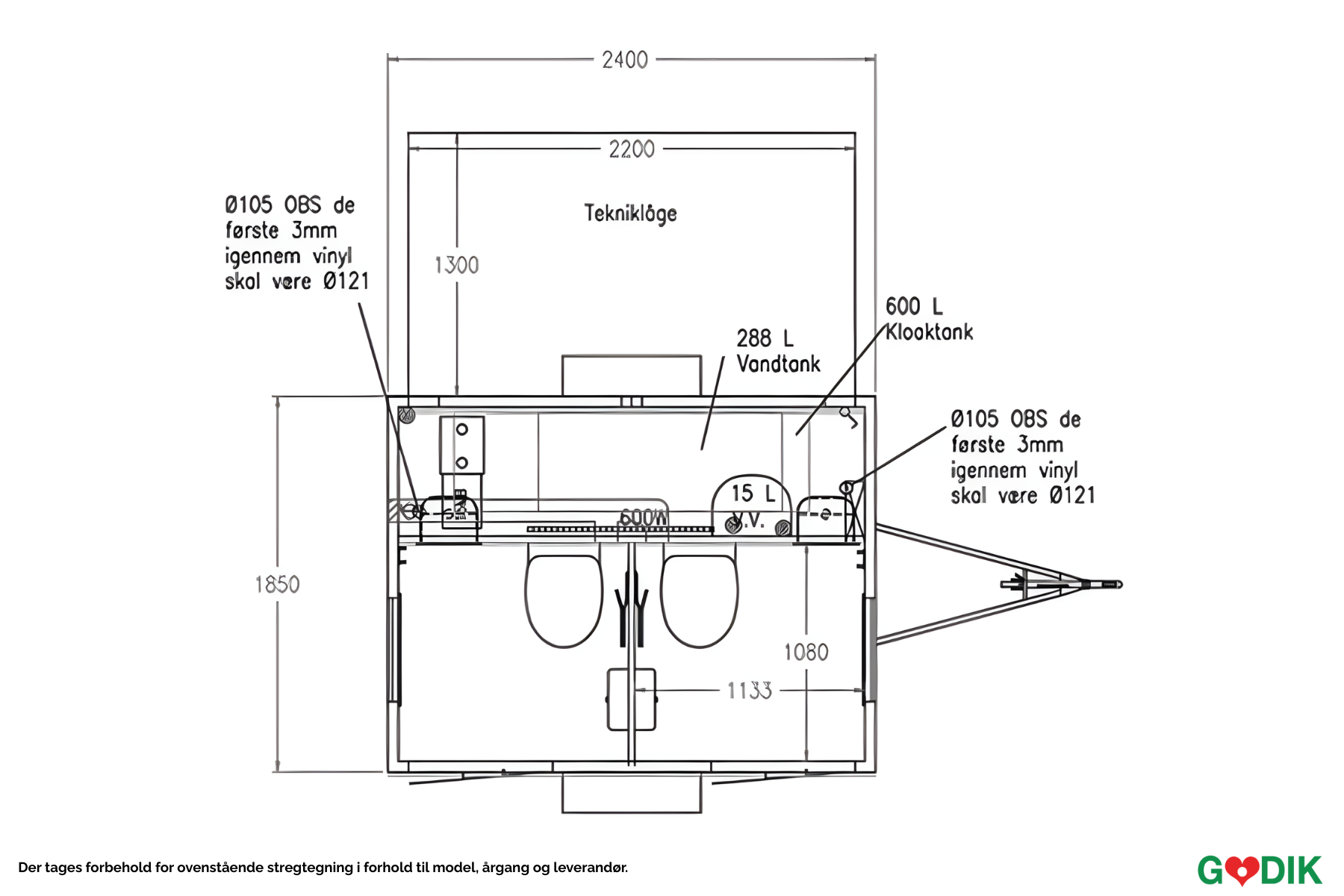 Toalettvogn med tank og 2 vakuumtoaletter. Tankkapasitet på ca. 600 besøk. Kapasitet på ca. 50 besøk per time.