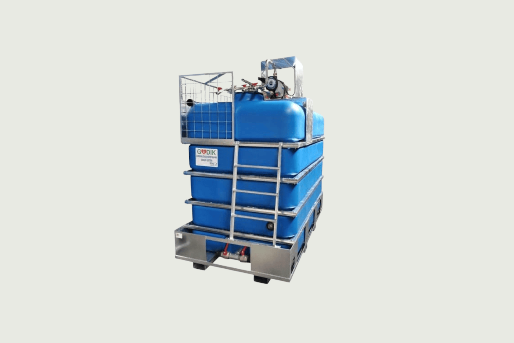 5.000 liter vandtank på galvaniseret stativ med stige og gaffellommer.
