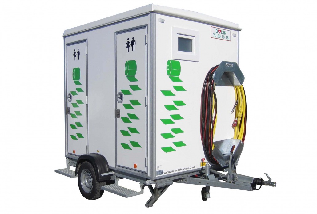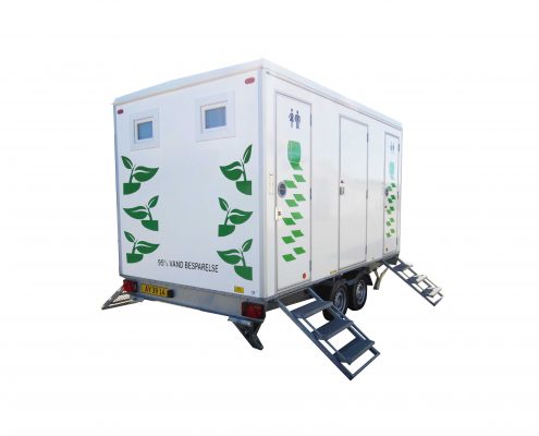 Ønsker du litt mer komfort, og har mulighet til å koble til strøm 400V/16A, anbefaler vi de hvite luksustoalettvognene 02134 – Toalettvogn 2 WC og 02136 – Toalettvogn 4 WC. Her får du en vakuumtoalettvogn med vasker og toaletter med vakuumsystem, som du kjenner fra toalettene på fly og ferger. Vakuumtoalettene er miljøvennlige, da de sparer opptil 95 % vann sammenlignet med vanlige toaletter.